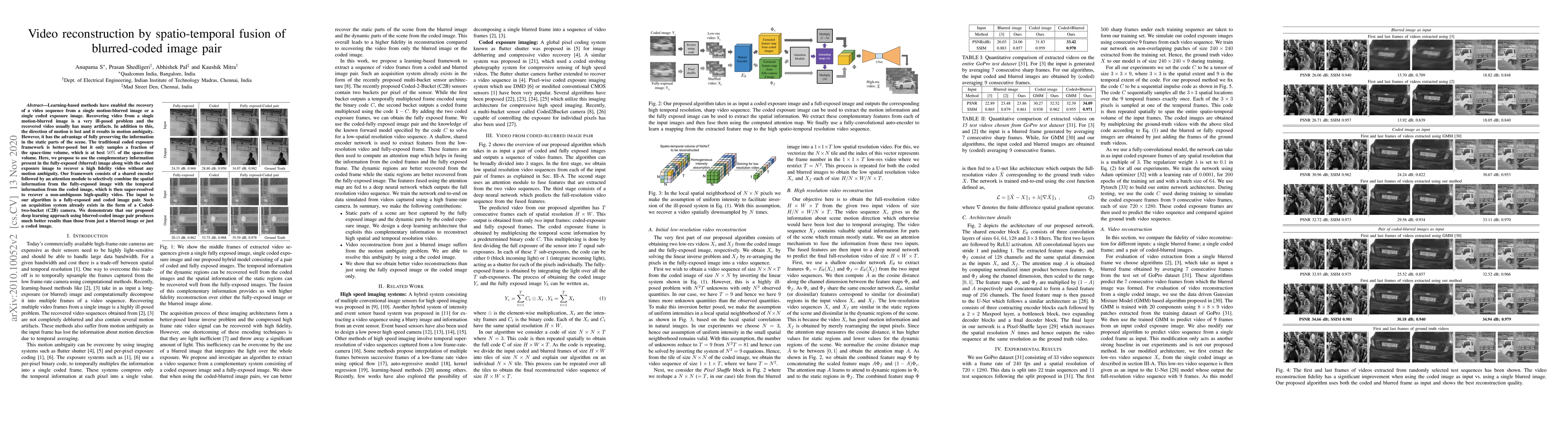 This paper proposes a deep learning method to reconstruct high-fidelity videos by fusing information from both a blurred-coded image pair. The approach combines spatial details from a fully-exposed blurred image with temporal data from a coded exposure image to achieve a non-ambiguous, artifact-free video.