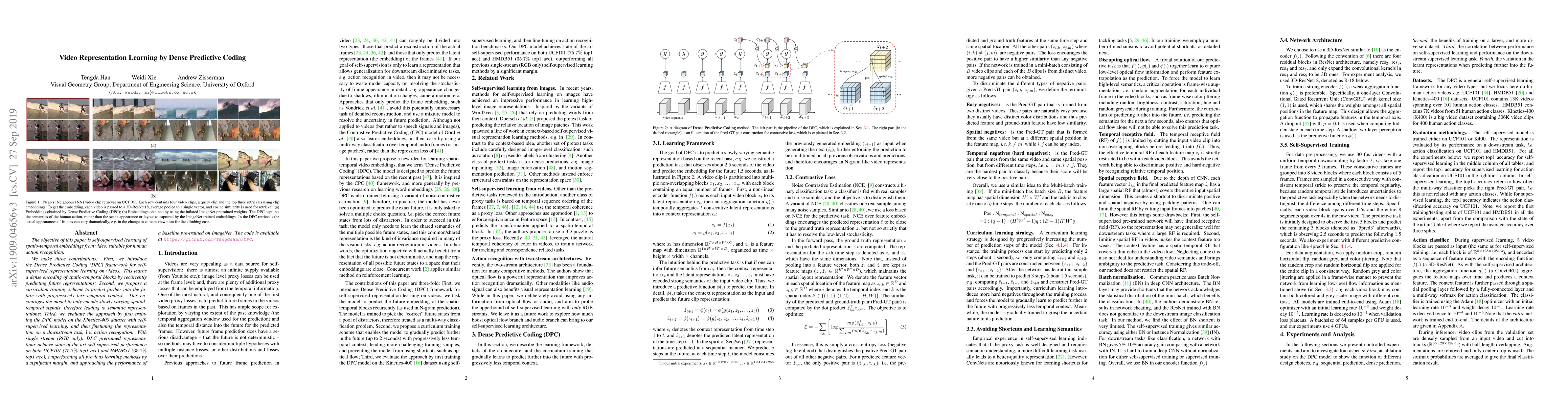 This paper introduces the Dense Predictive Coding (DPC) framework for self-supervised learning of spatio-temporal video embeddings, achieving state-of-the-art performance in human action recognition on UCF101 and HMDB51 datasets. It employs a curriculum training scheme to focus on slowly varying signals, leading to semantic representations.