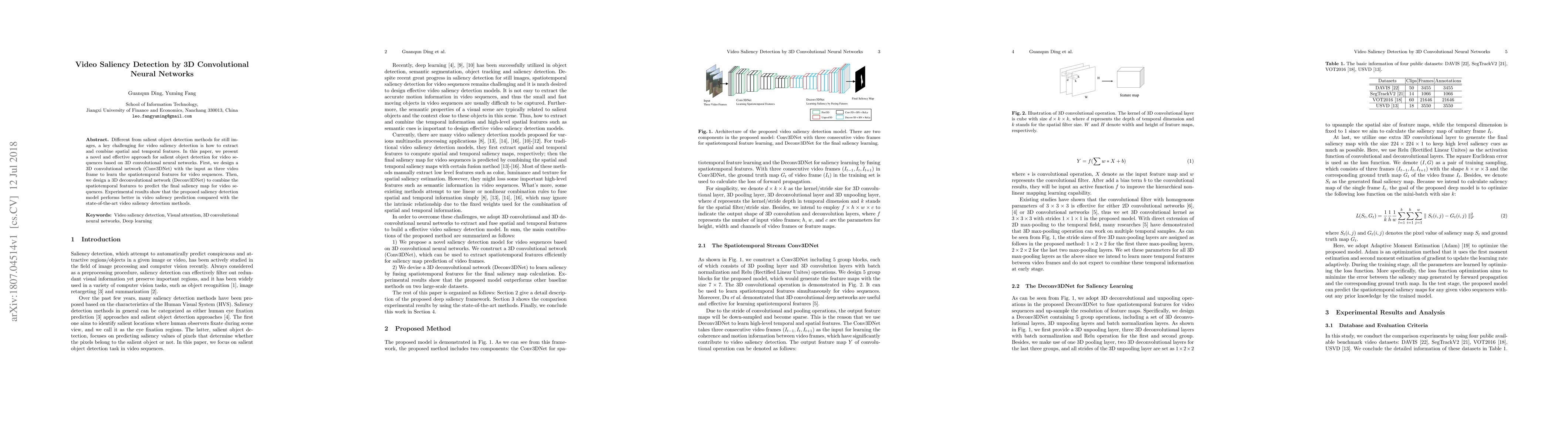 This paper proposes a novel 3D convolutional neural network for video saliency detection, utilizing both spatial and temporal features through a 3D convolutional network and a 3D deconvolutional network to predict saliency maps, outperforming existing methods.