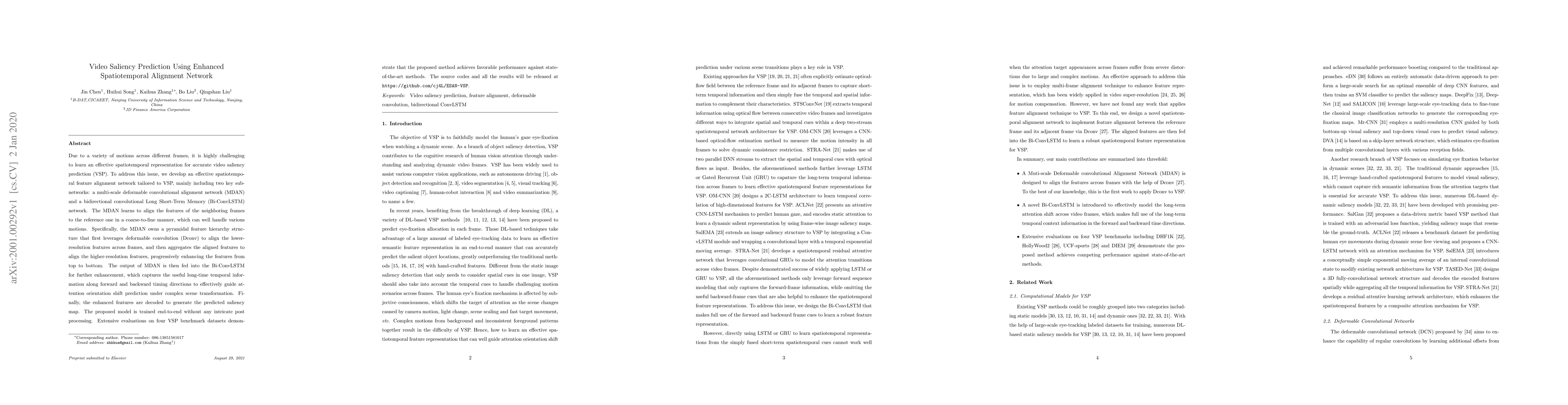 This paper proposes a spatiotemporal feature alignment network for video saliency prediction, consisting of a multi-scale deformable convolutional alignment network (MDAN) and a bidirectional convolutional LSTM (Bi-ConvLSTM). The MDAN aligns features across frames in a coarse-to-fine manner, while the Bi-ConvLSTM captures temporal information to guide attention shift prediction, achieving superior performance on benchmark datasets.