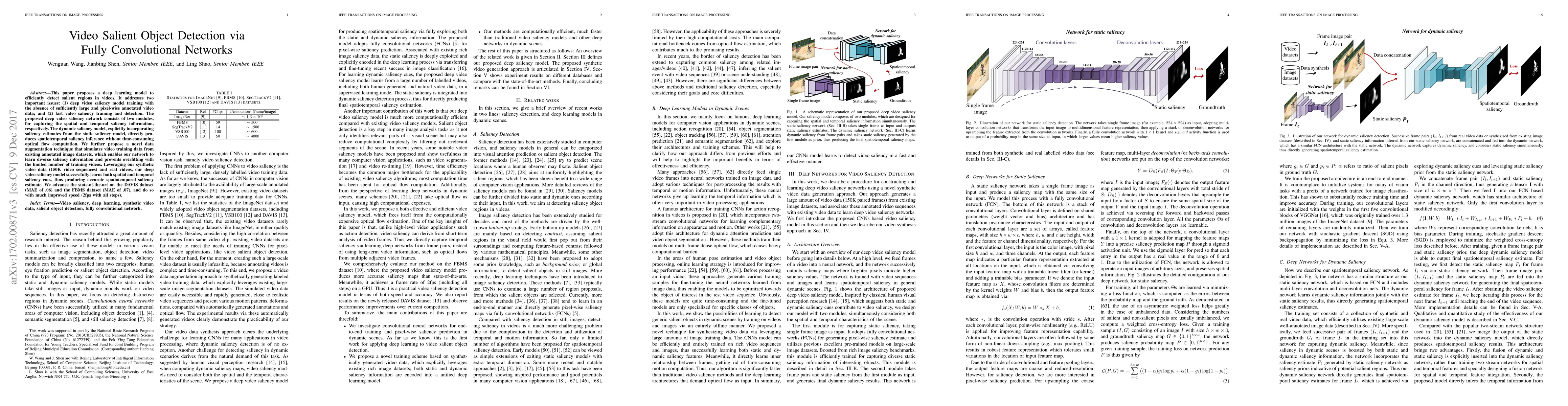 This research introduces a deep learning model using fully convolutional networks to detect salient regions in videos efficiently. It tackles challenges of limited annotated video data and slow processing by proposing a two-module network for spatial and temporal saliency capture, along with a novel data augmentation technique. The model, trained on synthetic and real video data, outperforms existing methods on DAVIS and FBMS datasets with improved speed.