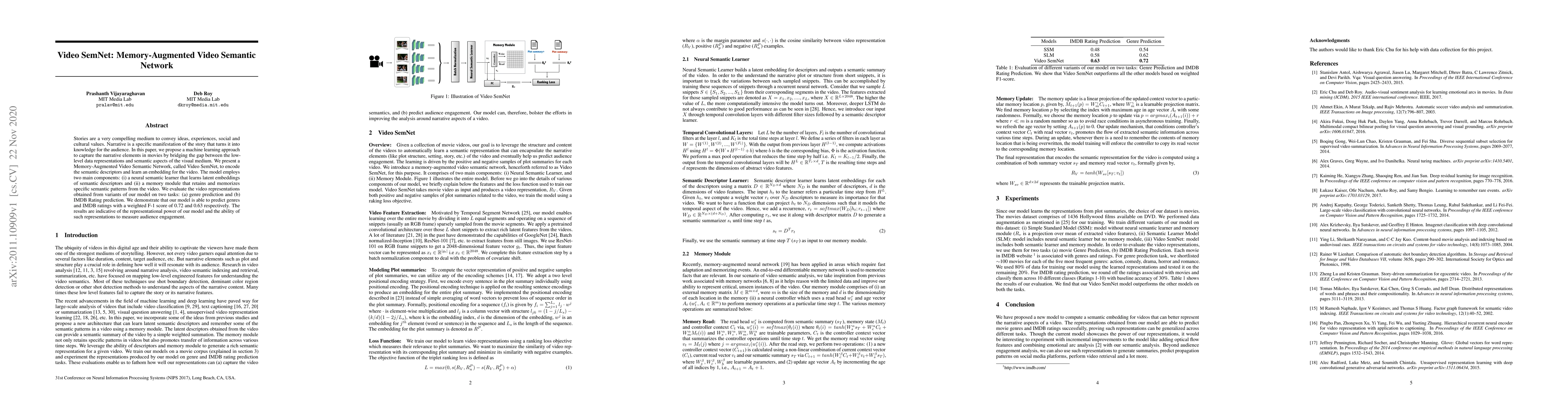 Stories are a very compelling medium to convey ideas, experiences, social and cultural values. Narrative is a specific manifestation of the story that turns it into knowledge for the audience. In this paper, we propose a machine learning approach to capture the narrative elements in movies by bridging the gap between the low-level data representations and semantic aspects of the visual medium. We present a Memory-Augmented Video Semantic Network, called Video SemNet, to encode the semantic descriptors and learn an embedding for the video. The model employs two main components: (i) a neural semantic learner that learns latent embeddings of semantic descriptors and (ii) a memory module that retains and memorizes specific semantic patterns from the video. We evaluate the video representations obtained from variants of our model on two tasks: (a) genre prediction and (b) IMDB Rating prediction. We demonstrate that our model is able to predict genres and IMDB ratings with a weighted F-1 score of 0.72 and 0.63 respectively. The results are indicative of the representational power of our model and the ability of such representations to measure audience engagement.