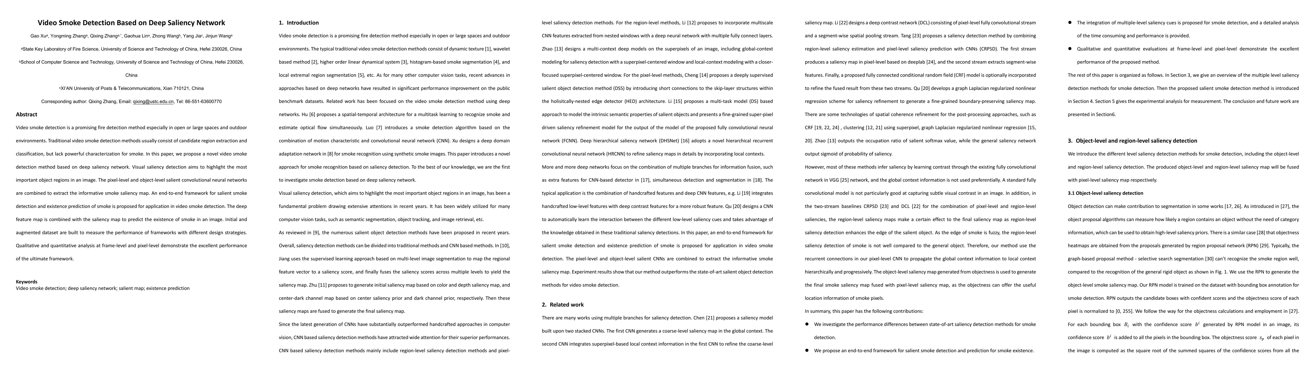 This paper proposes a novel video smoke detection method using a deep saliency network that combines pixel-level and object-level salient convolutional neural networks to create a smoke saliency map, achieving superior detection performance in open or large spaces. The framework's effectiveness is validated through qualitative and quantitative analysis on both frame-level and pixel-level.