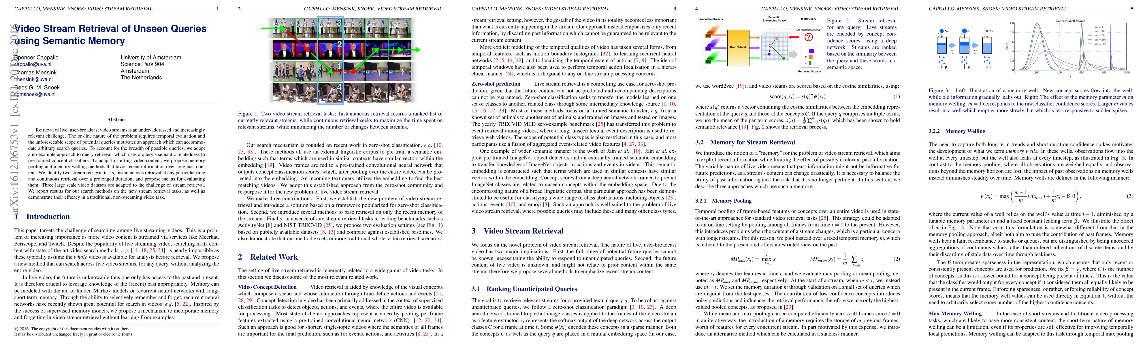 Retrieval of live, user-broadcast video streams is an under-addressed and increasingly relevant challenge. The on-line nature of the problem requires temporal evaluation and the unforeseeable scope of potential queries motivates an approach which can accommodate arbitrary search queries. To account for the breadth of possible queries, we adopt a no-example approach to query retrieval, which uses a query's semantic relatedness to pre-trained concept classifiers. To adapt to shifting video content, we propose memory pooling and memory welling methods that favor recent information over long past content. We identify two stream retrieval tasks, instantaneous retrieval at any particular time and continuous retrieval over a prolonged duration, and propose means for evaluating them. Three large scale video datasets are adapted to the challenge of stream retrieval. We report results for our search methods on the new stream retrieval tasks, as well as demonstrate their efficacy in a traditional, non-streaming video task.