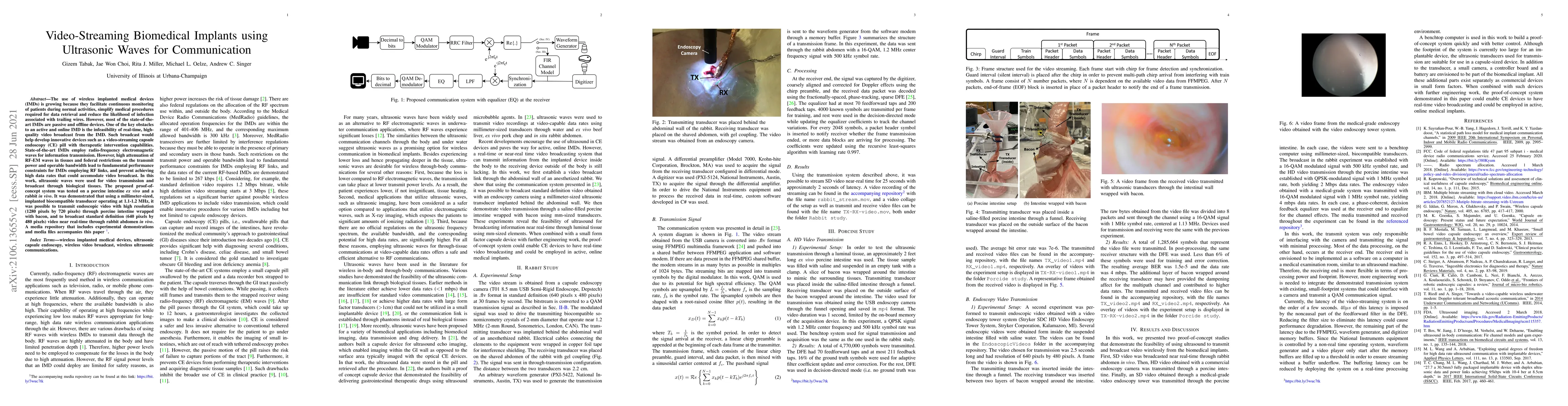 This paper proposes a method for transmitting high-resolution video through biological tissues using ultrasonic waves, overcoming the limitations of RF-EM waves in implanted medical devices. Experimental results show successful video transmission in both ex vivo and in vivo settings, paving the way for advanced video-streaming biomedical implants.