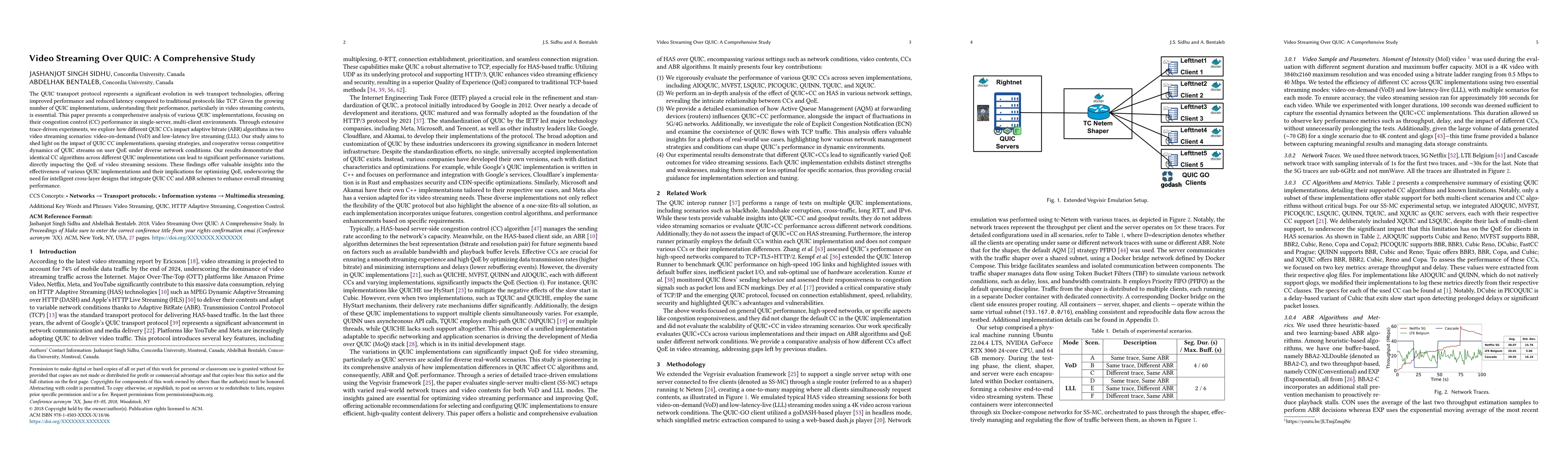 The paper employs extensive trace-driven experiments to analyze various QUIC implementations' congestion control (CC) performance in single-server, multi-client video streaming environments.