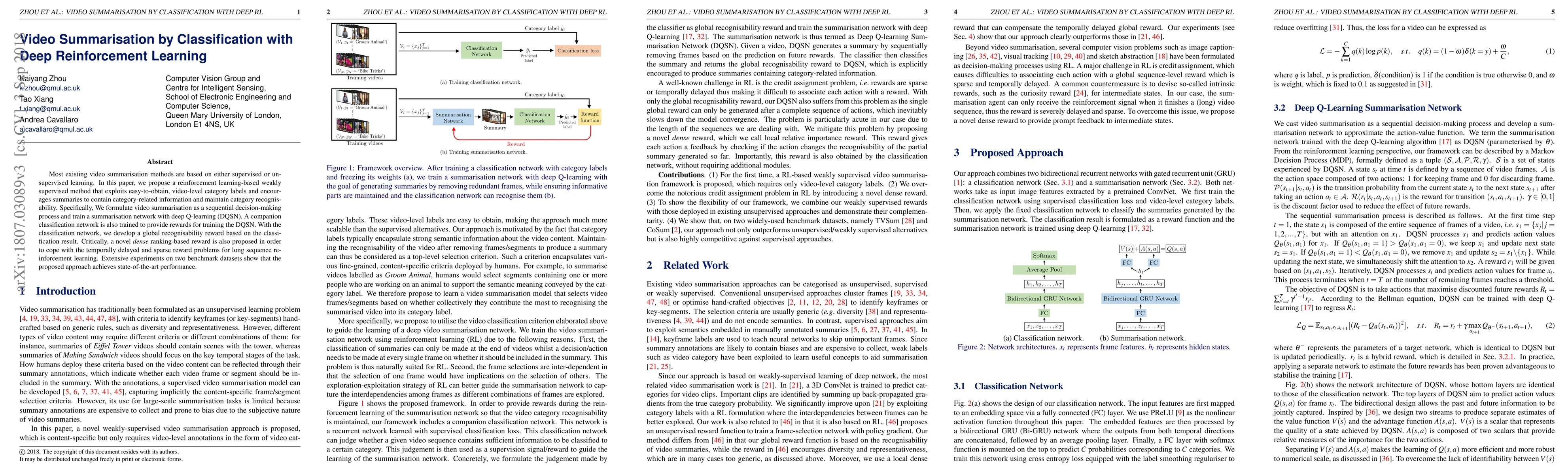 This paper proposes a novel reinforcement learning-based method for video summarisation using weak supervision from video-level category labels. It employs deep Q-learning and a classification network to generate summaries that maintain category recognisability, achieving state-of-the-art performance on benchmark datasets.