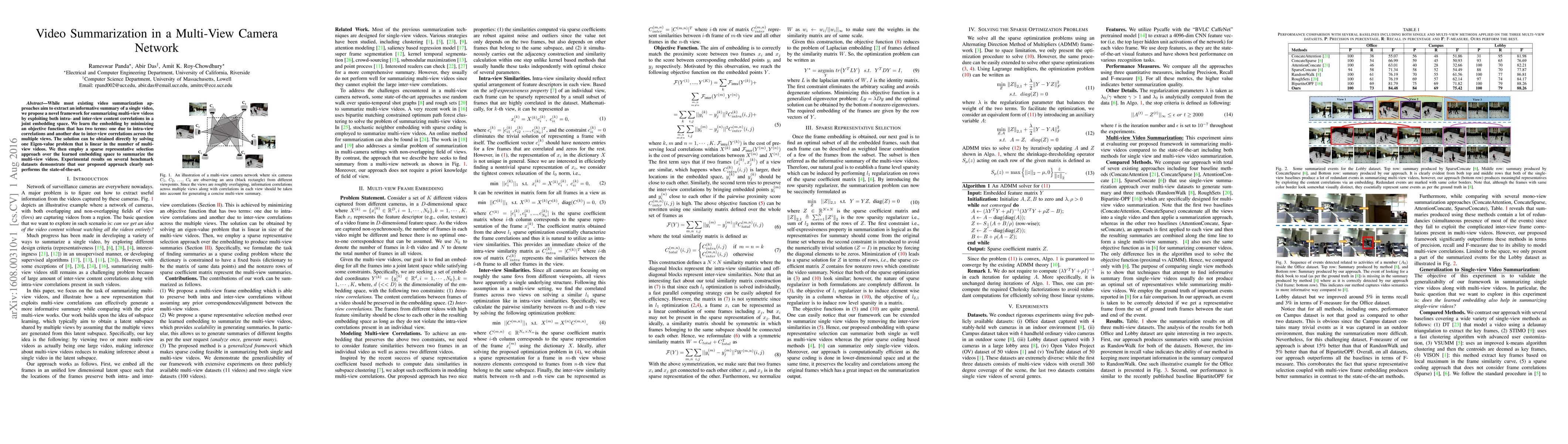 This paper proposes a novel framework for summarizing multi-view videos by leveraging intra-view and inter-view correlations in a joint embedding space. The method solves an Eigen-value problem to learn the embedding, followed by a sparse selection approach for video summarization, outperforming existing state-of-the-art methods on benchmark datasets.