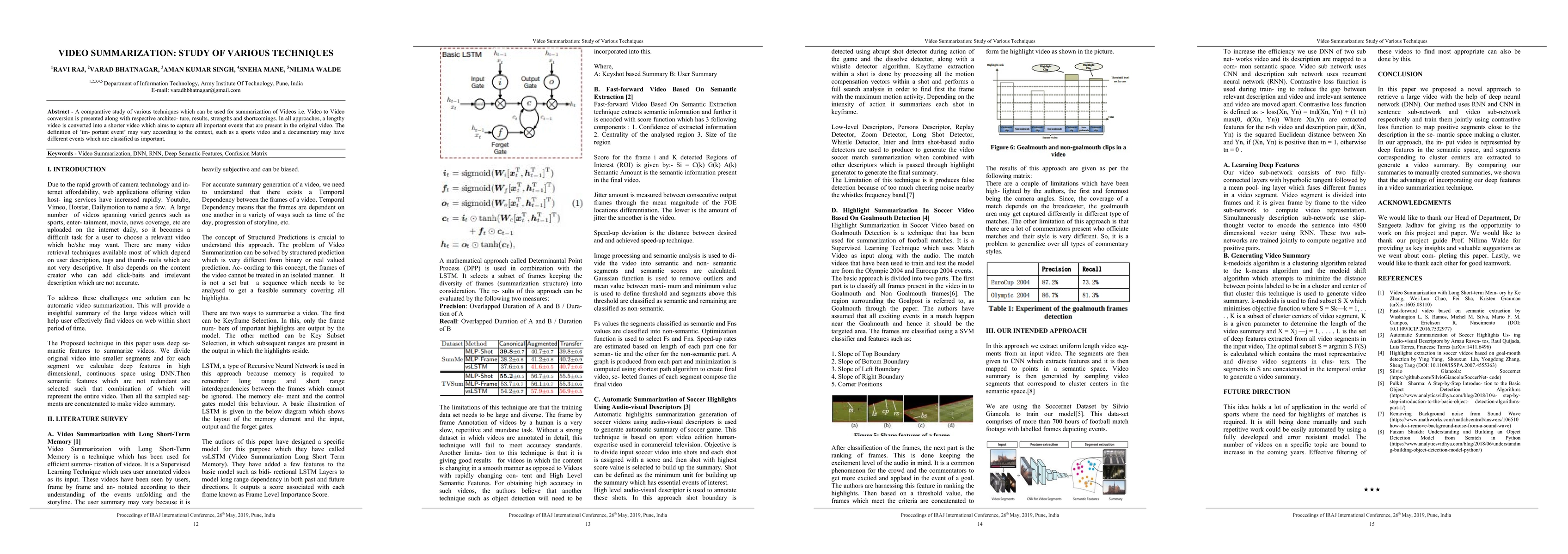 This paper compares various techniques for video summarization, converting lengthy videos into shorter ones that capture key events, with each approach's architecture, results, strengths, and weaknesses analyzed. The definition of 'important events' varies by context, such as sports versus documentary videos.