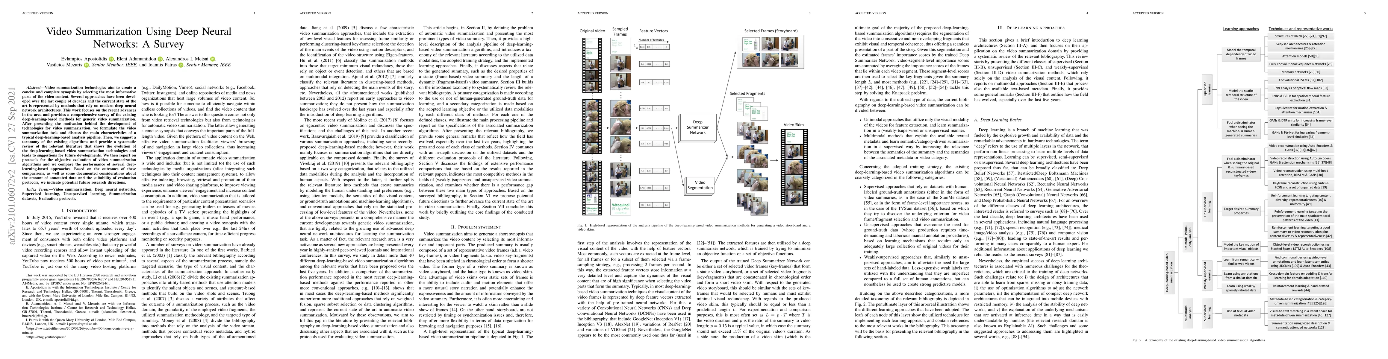 This paper surveys recent advances in deep-learning-based methods for video summarization, analyzing the evolution of these technologies and suggesting future research directions based on comparative performance and evaluation protocols. It also proposes a taxonomy for existing algorithms and discusses the characteristics of deep-learning analysis pipelines.
