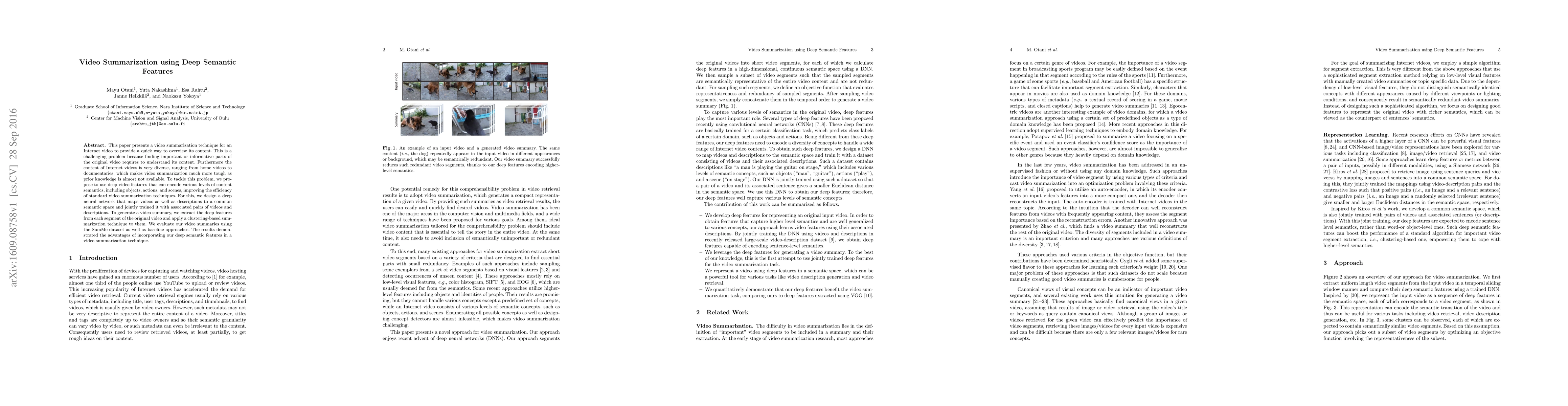 This paper proposes a video summarization technique using deep semantic features to efficiently extract important segments from diverse Internet videos. It employs a deep neural network to map videos and descriptions to a common semantic space, followed by clustering-based summarization, demonstrating superior performance over baseline methods.