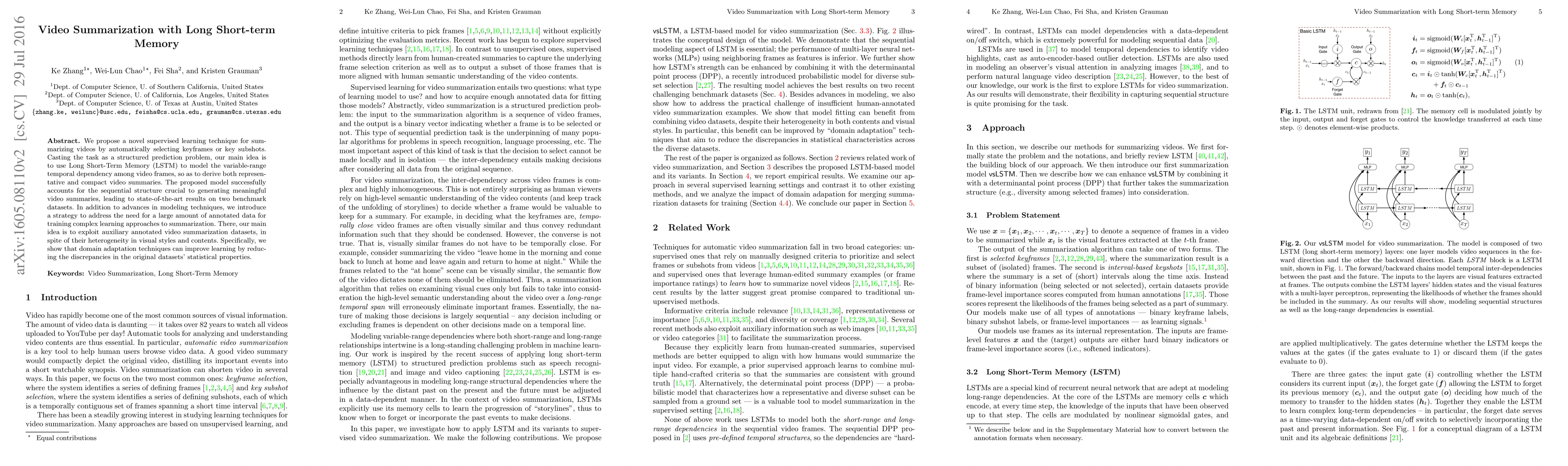 This paper proposes a novel supervised learning technique using Long Short-Term Memory (LSTM) networks to summarize videos by selecting keyframes or subshots. The authors achieve state-of-the-art results by modeling sequential structures in videos and employing domain adaptation techniques to leverage auxiliary annotated datasets.