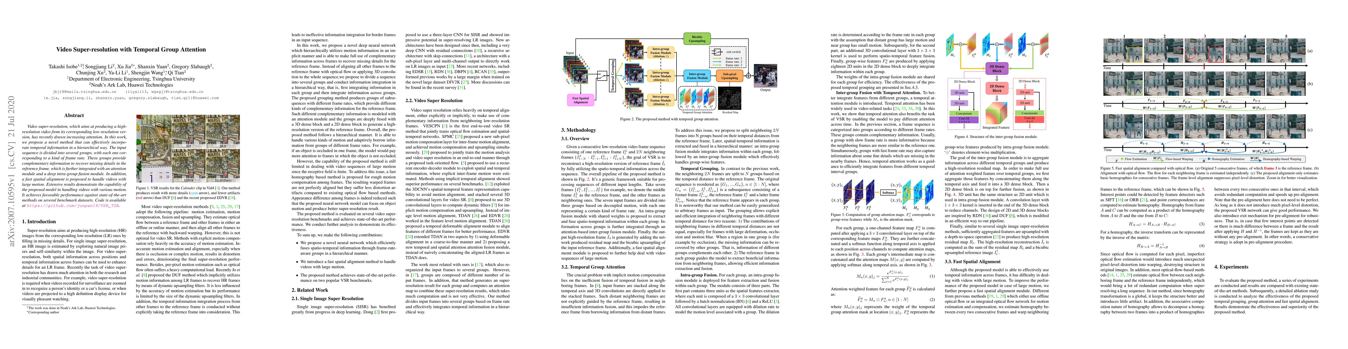 This paper proposes a novel video super-resolution method that hierarchically incorporates temporal information through group attention and intra-group fusion, achieving superior performance on benchmark datasets compared to state-of-the-art techniques. The method also includes a fast spatial alignment to manage videos with significant motion.