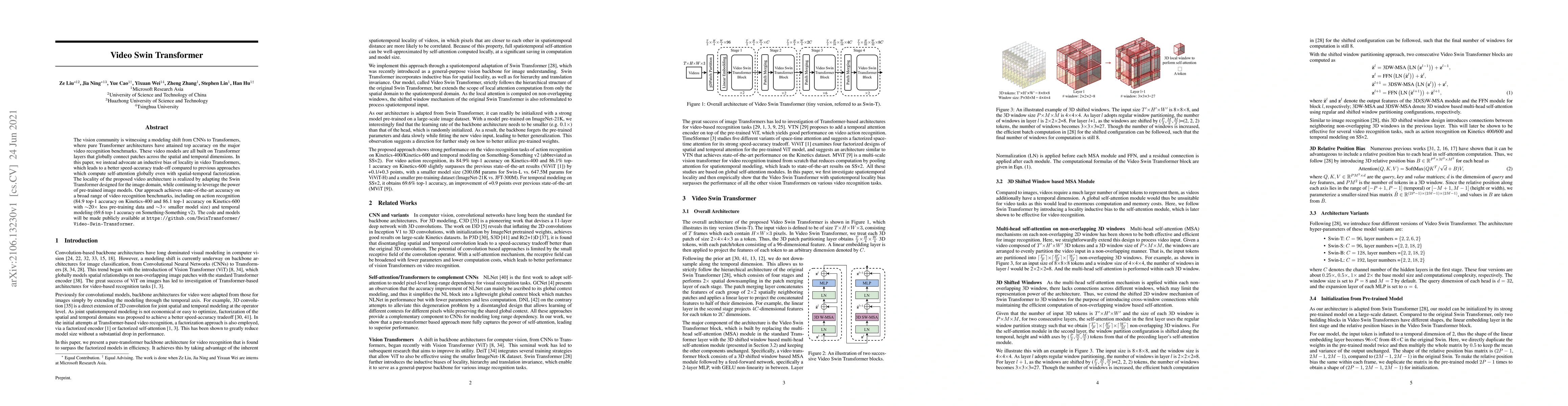 The vision community is witnessing a modeling shift from CNNs to Transformers, where pure Transformer architectures have attained top accuracy on the major video recognition benchmarks. These video models are all built on Transformer layers that globally connect patches across the spatial and temporal dimensions. In this paper, we instead advocate an inductive bias of locality in video Transformers, which leads to a better speed-accuracy trade-off compared to previous approaches which compute self-attention globally even with spatial-temporal factorization. The locality of the proposed video architecture is realized by adapting the Swin Transformer designed for the image domain, while continuing to leverage the power of pre-trained image models. Our approach achieves state-of-the-art accuracy on a broad range of video recognition benchmarks, including on action recognition (84.9 top-1 accuracy on Kinetics-400 and 86.1 top-1 accuracy on Kinetics-600 with ~20x less pre-training data and ~3x smaller model size) and temporal modeling (69.6 top-1 accuracy on Something-Something v2). The code and models will be made publicly available at https://github.com/SwinTransformer/Video-Swin-Transformer.