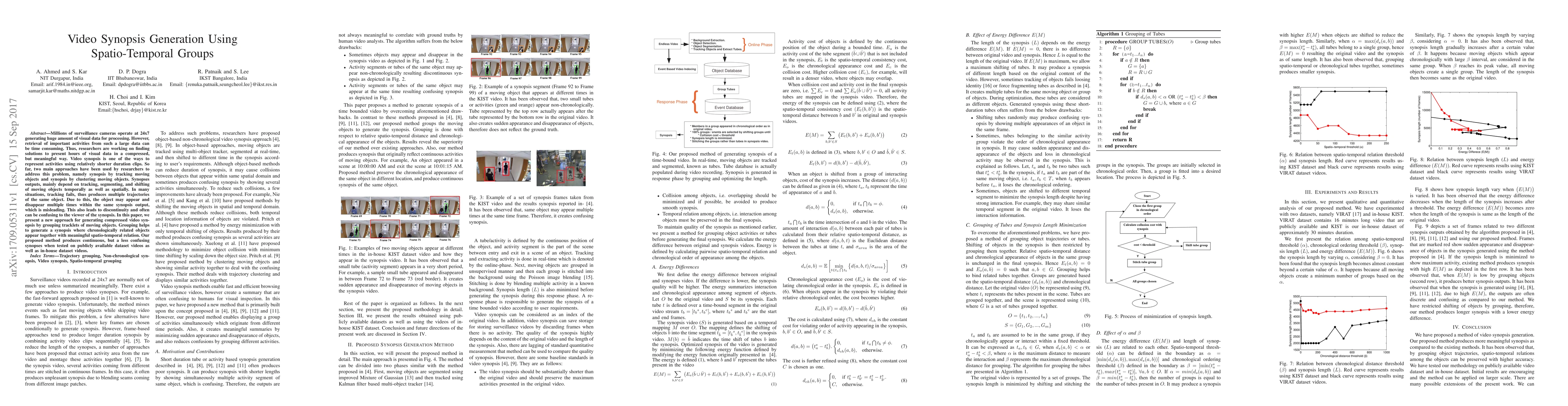 This paper proposes a novel approach to generate compressed video synopses by grouping tracklets of moving objects to create a continuous and meaningful spatio-temporal relation, addressing the issue of misleading multiple trajectories and discontinuities in previous tracking-based methods. The method was tested on both public and in-house dataset videos, showing improved clarity and coherence in the synopses.