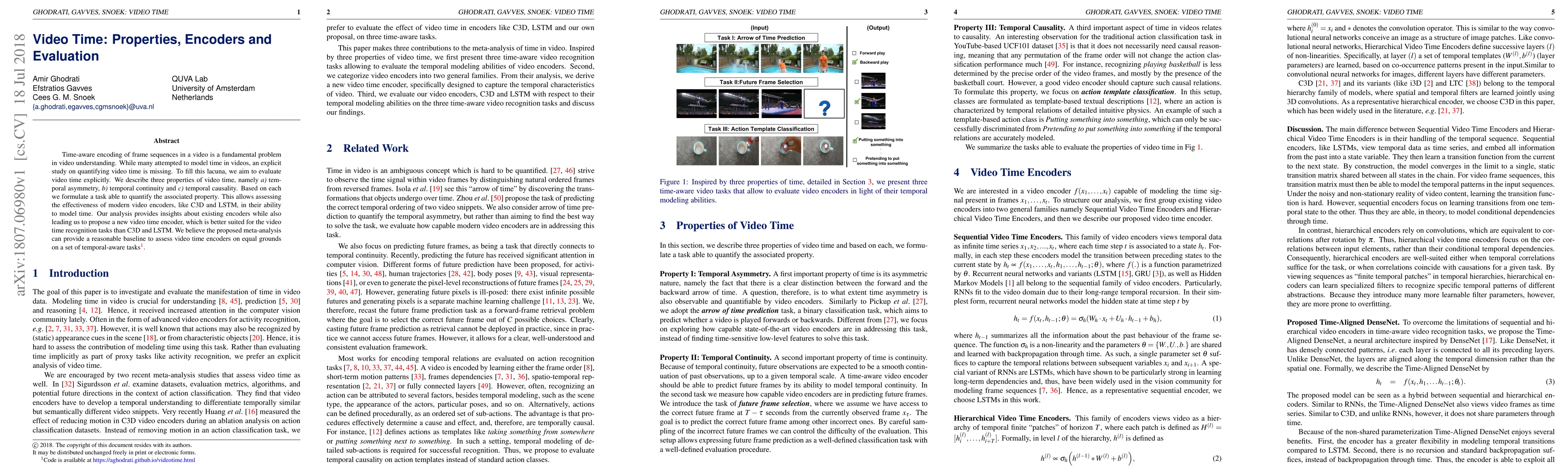 The paper investigates video time properties (temporal asymmetry, continuity, and causality) through three tasks, proposing a new encoder, Time-Aligned DenseNet, which outperforms existing encoders like C3D and LSTM.