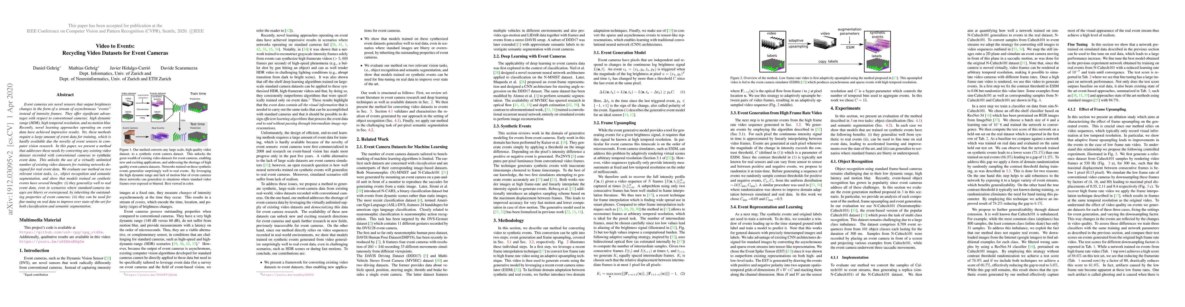 This paper proposes a method to convert existing video datasets into synthetic event data for training networks designed for event cameras, addressing the scarcity of real event data. The approach demonstrates benefits in object recognition and semantic segmentation, showing improved generalization and fine-tuning capabilities for real event data.