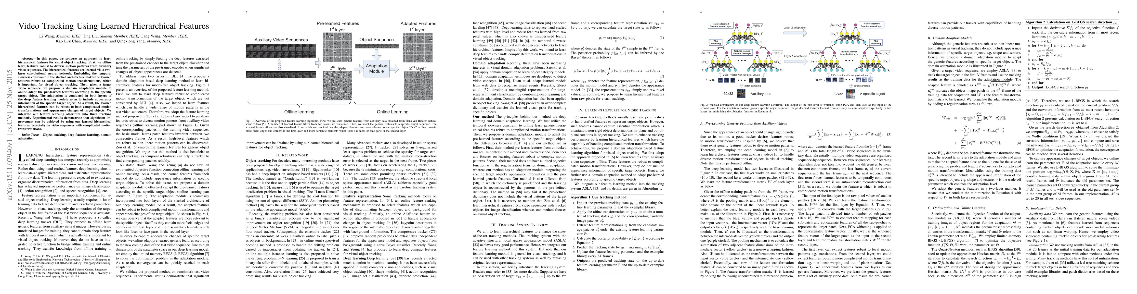 In this paper, we propose an approach to learn hierarchical features for visual object tracking. First, we offline learn features robust to diverse motion patterns from auxiliary video sequences. The hierarchical features are learned via a two-layer convolutional neural network. Embedding the temporal slowness constraint in the stacked architecture makes the learned features robust to complicated motion transformations, which is important for visual object tracking. Then, given a target video sequence, we propose a domain adaptation module to online adapt the pre-learned features according to the specific target object. The adaptation is conducted in both layers of the deep feature learning module so as to include appearance information of the specific target object. As a result, the learned hierarchical features can be robust to both complicated motion transformations and appearance changes of target objects. We integrate our feature learning algorithm into three tracking methods. Experimental results demonstrate that significant improvement can be achieved using our learned hierarchical features, especially on video sequences with complicated motion transformations.