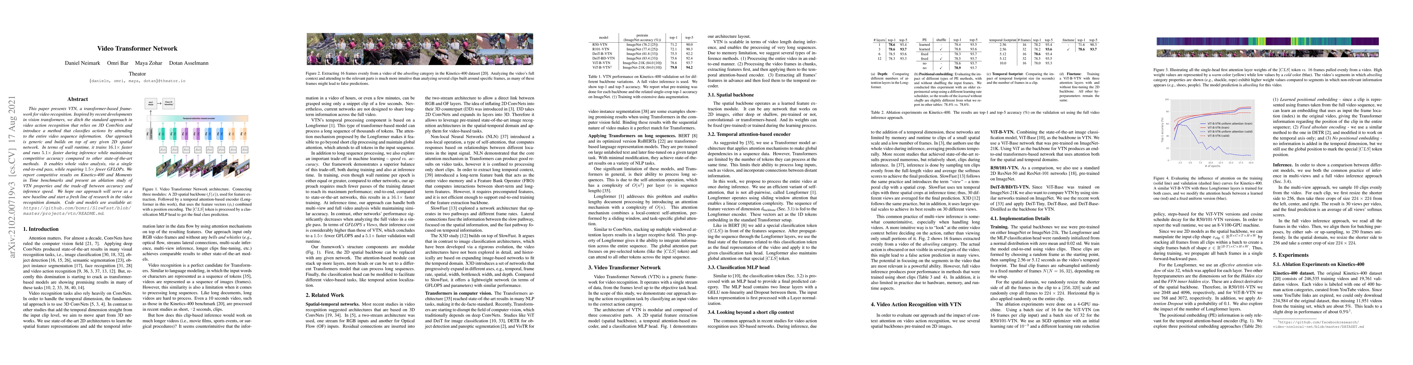 This paper presents VTN, a transformer-based framework for video recognition. Inspired by recent developments in vision transformers, we ditch the standard approach in video action recognition that relies on 3D ConvNets and introduce a method that classifies actions by attending to the entire video sequence information. Our approach is generic and builds on top of any given 2D spatial network. In terms of wall runtime, it trains $16.1\times$ faster and runs $5.1\times$ faster during inference while maintaining competitive accuracy compared to other state-of-the-art methods. It enables whole video analysis, via a single end-to-end pass, while requiring $1.5\times$ fewer GFLOPs. We report competitive results on Kinetics-400 and present an ablation study of VTN properties and the trade-off between accuracy and inference speed. We hope our approach will serve as a new baseline and start a fresh line of research in the video recognition domain. Code and models are available at: https://github.com/bomri/SlowFast/blob/master/projects/vtn/README.md