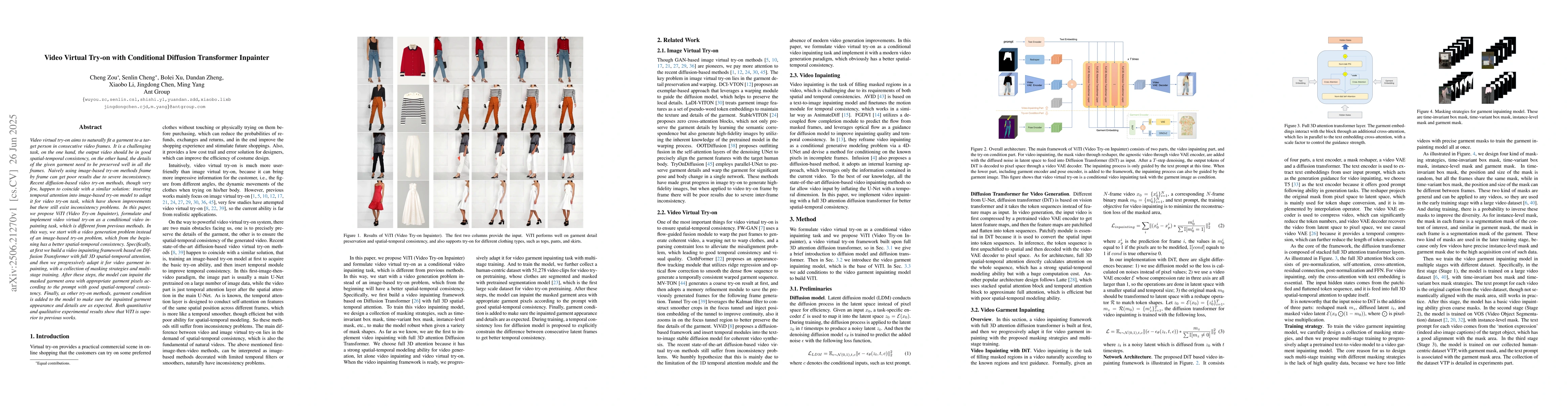 The paper introduces ViTI (Video Try-on Inpainter), a method for video virtual try-on that formulates the task as a conditional video inpainting problem. Unlike previous approaches, ViTI uses a Diffusion Transformer with 3D spatial-temporal attention to ensure better spatial-temporal consistency. The model is adapted for video garment inpainting through masking strategies and multi-stage training. Results demonstrate ViTI's superiority over existing methods in maintaining consistency and accurately representing garment details across video frames.