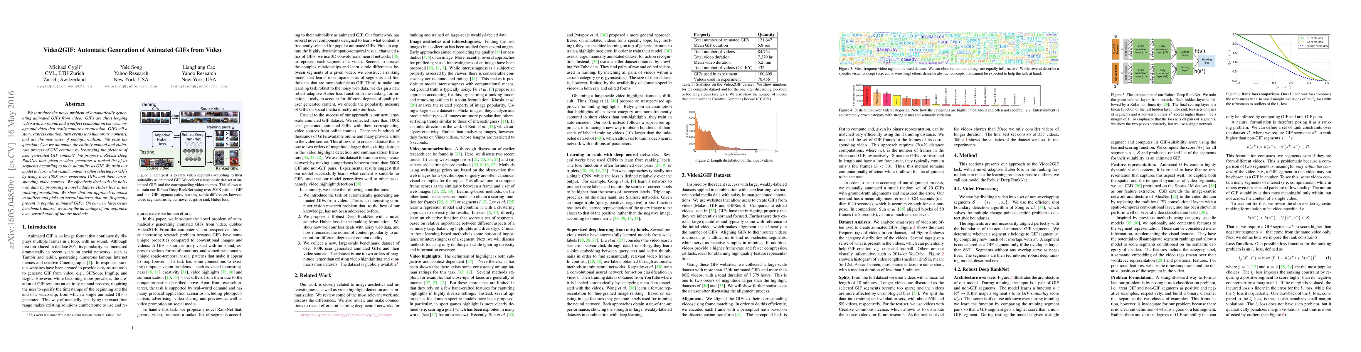 This paper proposes a Robust Deep RankNet to automate the generation of animated GIFs from video, leveraging over 100K user-generated GIFs to train the model. The method uses an adaptive Huber loss to handle noisy data and outperforms state-of-the-art techniques on a new benchmark dataset.