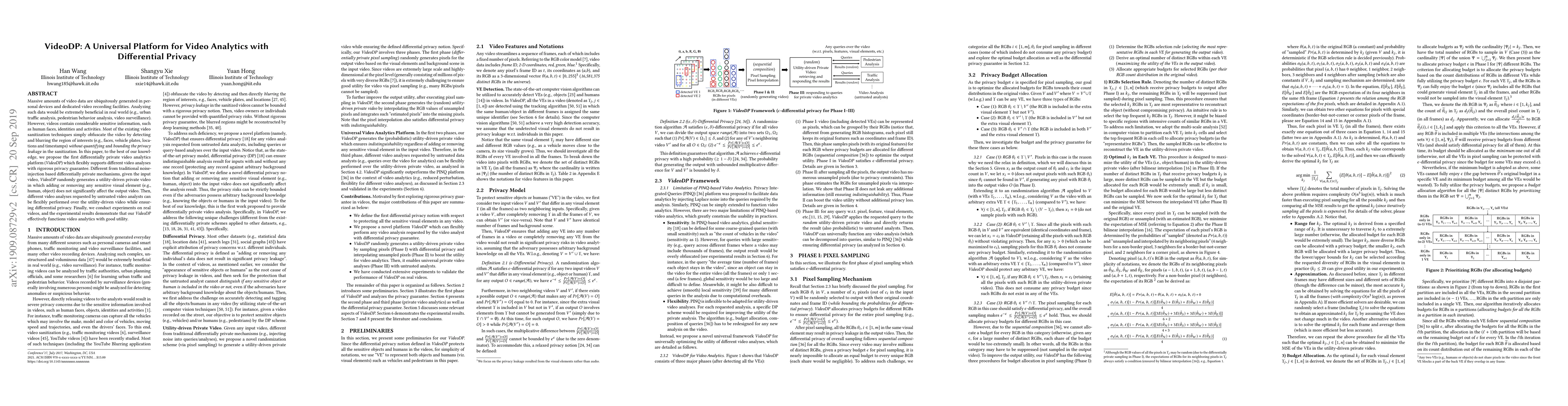 The paper proposes VideoDP, a novel differentially private platform for video analytics that ensures rigorous privacy protection while maintaining analysis utility. Unlike traditional methods, VideoDP generates a privacy-preserving video by randomly altering sensitive elements, enabling flexible and secure video analysis.