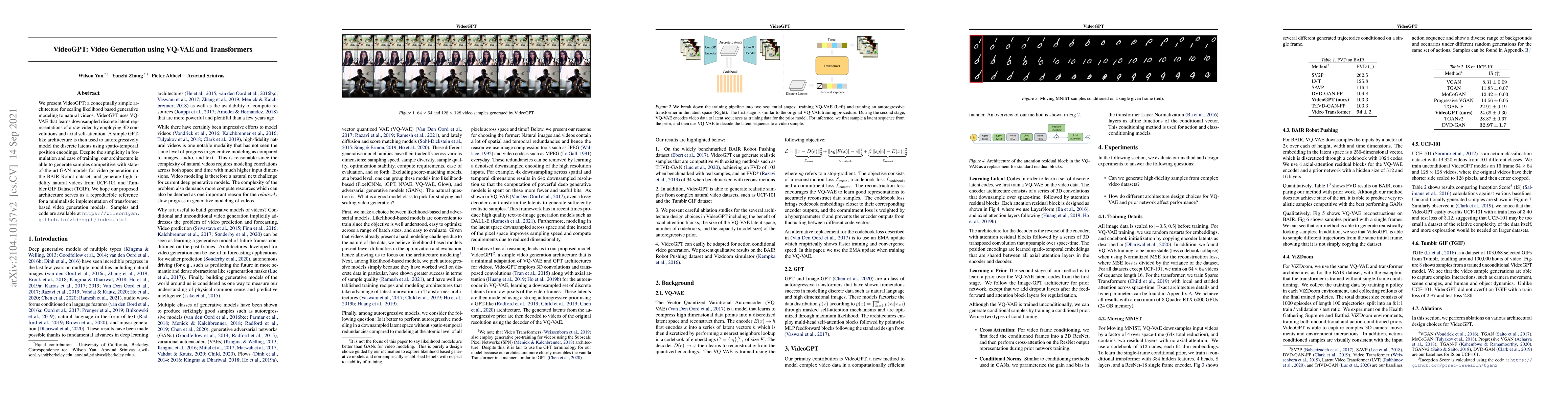 VideoGPT combines VQ-VAE and transformers for scalable video generation, achieving competitive results with GAN models on various datasets. The architecture uses 3D convolutions and axial self-attention in VQ-VAE, followed by a GPT-like model for autoregressive latent modeling.
