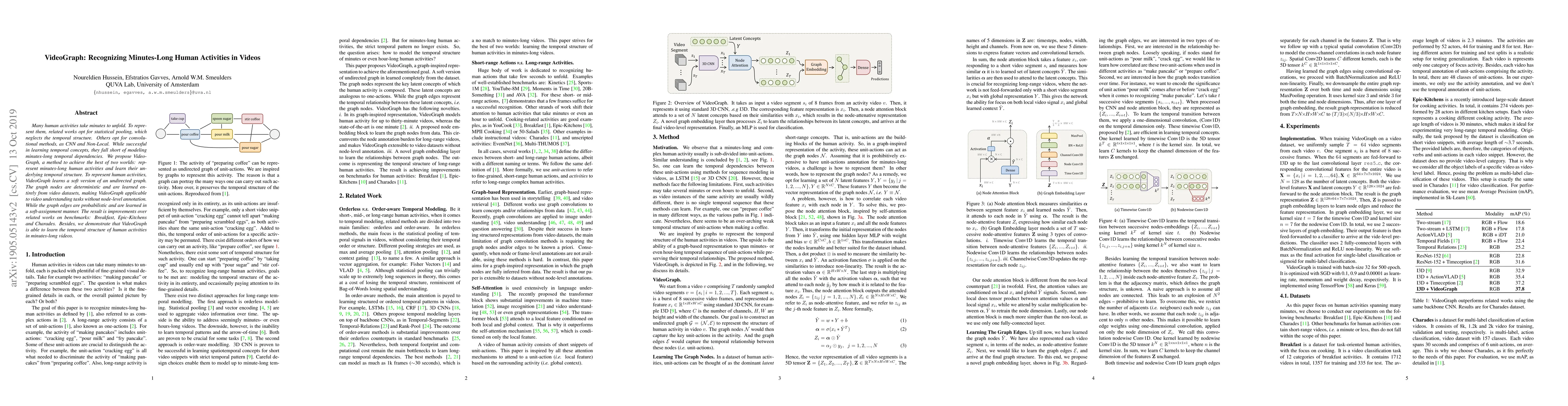 Many human activities take minutes to unfold. To represent them, related works opt for statistical pooling, which neglects the temporal structure. Others opt for convolutional methods, as CNN and Non-Local. While successful in learning temporal concepts, they are short of modeling minutes-long temporal dependencies. We propose VideoGraph, a method to achieve the best of two worlds: represent minutes-long human activities and learn their underlying temporal structure. VideoGraph learns a graph-based representation for human activities. The graph, its nodes and edges are learned entirely from video datasets, making VideoGraph applicable to problems without node-level annotation. The result is improvements over related works on benchmarks: Epic-Kitchen and Breakfast. Besides, we demonstrate that VideoGraph is able to learn the temporal structure of human activities in minutes-long videos.