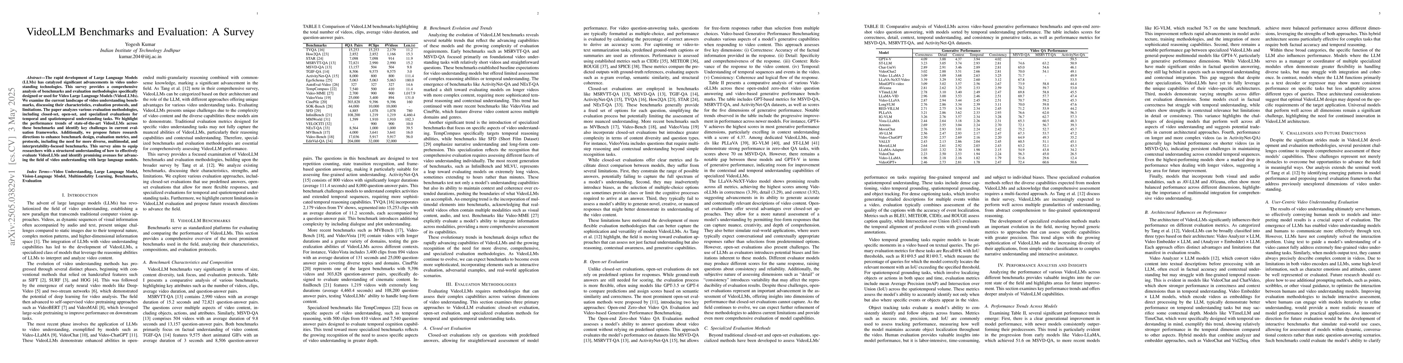 A survey evaluates video understanding benchmarks for Large Language Models, highlighting performance trends and identifying challenges in current evaluation frameworks. It proposes future research directions to enhance benchmark design, evaluation metrics, and protocols for advancing the field of video understanding.