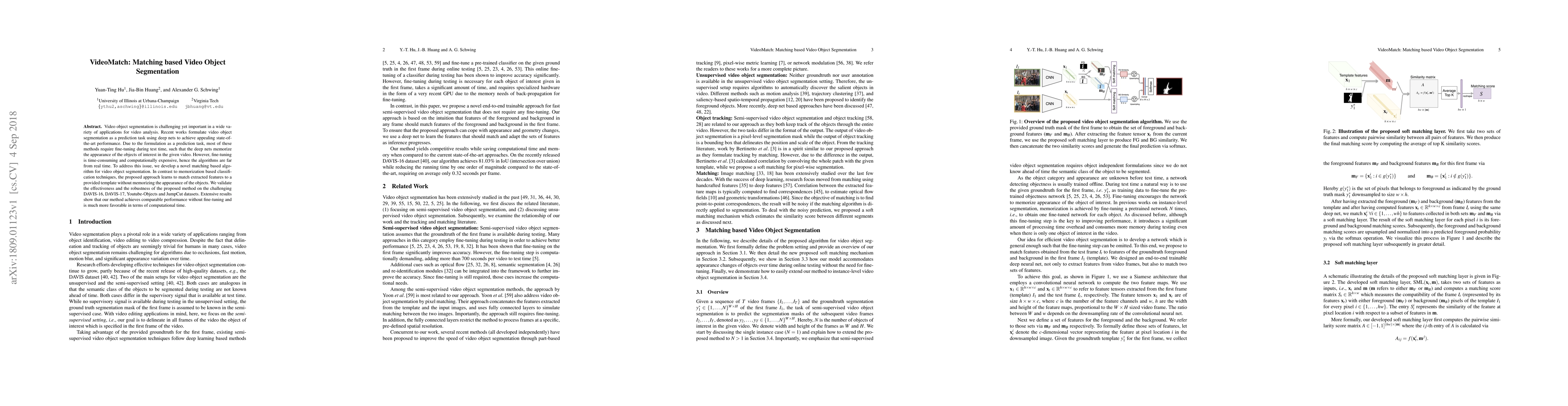 The paper introduces VideoMatch, a novel matching-based algorithm for video object segmentation that avoids the need for fine-tuning, achieving comparable performance to memorization-based methods while significantly reducing computational time. The method demonstrates effectiveness and robustness on multiple datasets, offering a real-time alternative to existing techniques.