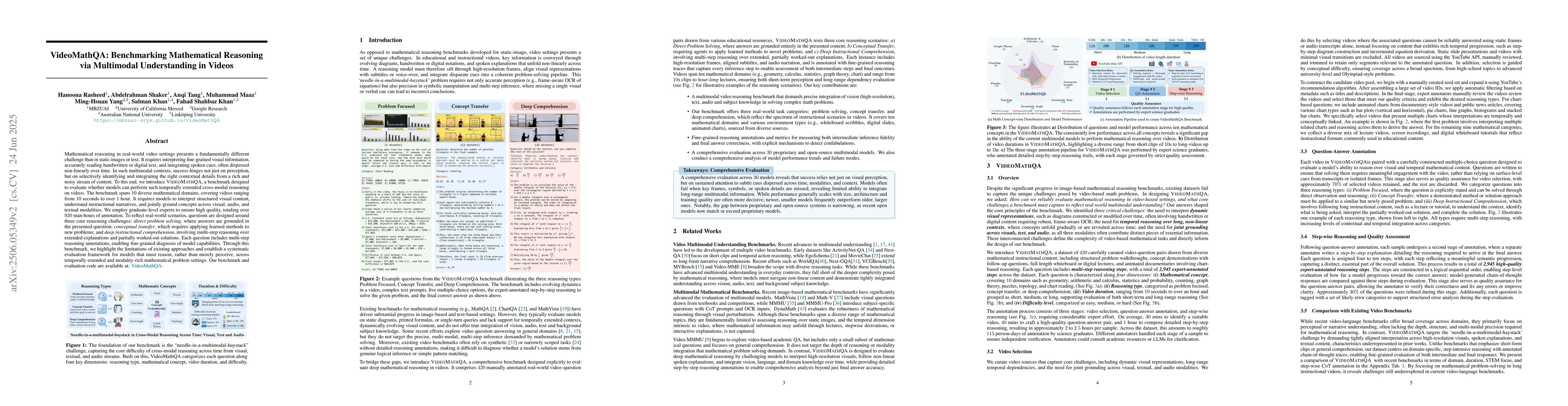 Mathematical reasoning in real-world video settings presents a fundamentally different challenge than in static images or text. It requires interpreting fine-grained visual information, accurately reading handwritten or digital text, and integrating spoken cues, often dispersed non-linearly over time. In such multimodal contexts, success hinges not just on perception, but on selectively identifying and integrating the right contextual details from a rich and noisy stream of content. To this end, we introduce VideoMathQA, a benchmark designed to evaluate whether models can perform such temporally extended cross-modal reasoning on videos. The benchmark spans 10 diverse mathematical domains, covering videos ranging from 10 seconds to over 1 hour. It requires models to interpret structured visual content, understand instructional narratives, and jointly ground concepts across visual, audio, and textual modalities. We employ graduate-level experts to ensure high quality, totaling over $920$ man-hours of annotation. To reflect real-world scenarios, questions are designed around three core reasoning challenges: direct problem solving, where answers are grounded in the presented question; conceptual transfer, which requires applying learned methods to new problems; and deep instructional comprehension, involving multi-step reasoning over extended explanations and partially worked-out solutions. Each question includes multi-step reasoning annotations, enabling fine-grained diagnosis of model capabilities. Through this benchmark, we highlight the limitations of existing approaches and establish a systematic evaluation framework for models that must reason, rather than merely perceive, across temporally extended and modality-rich mathematical problem settings. Our benchmark and evaluation code are available at: https://mbzuai-oryx.github.io/VideoMathQA