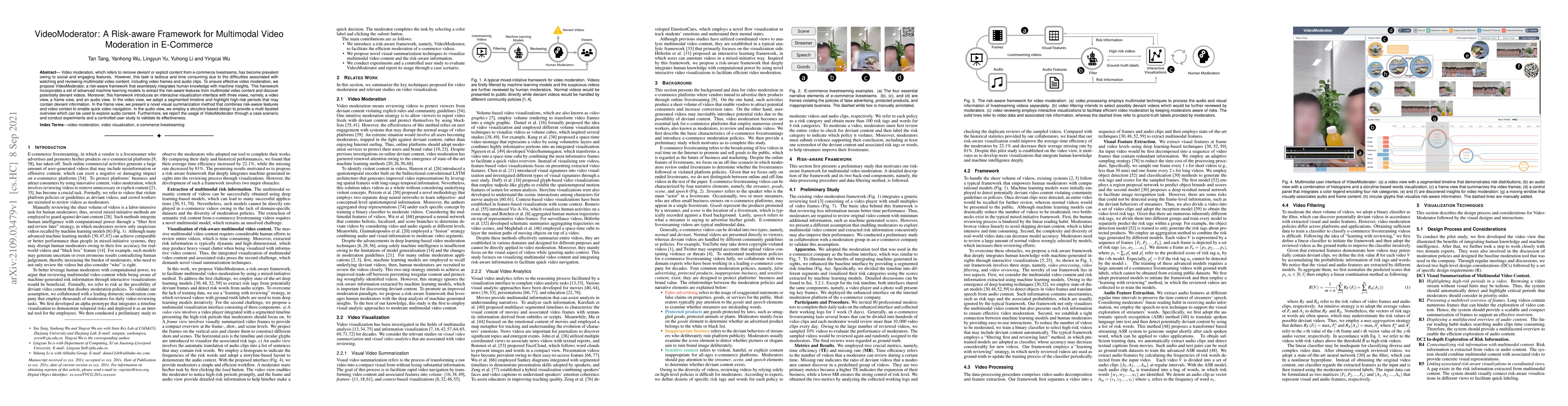 VideoModerator is a risk-aware framework for multimodal video moderation in e-commerce, combining machine learning models and human insights to identify deviant content. It features an interactive visualization interface with video, frame, and audio views to facilitate efficient content review.