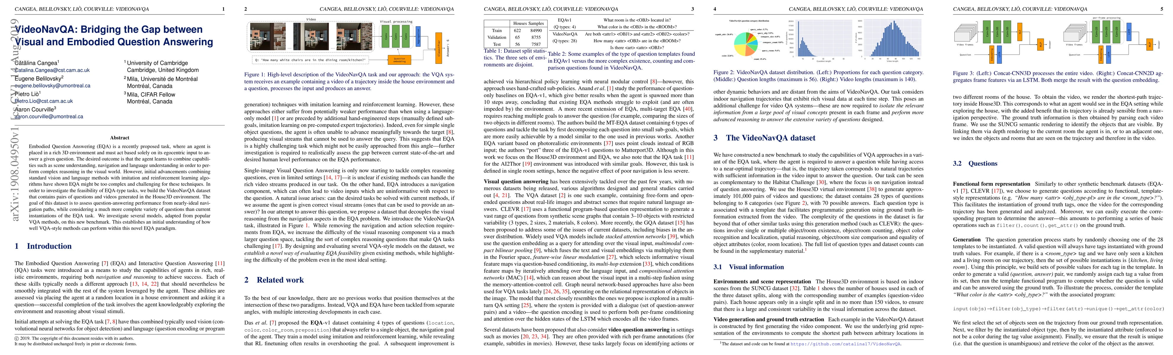 Embodied Question Answering (EQA) is a recently proposed task, where an agent is placed in a rich 3D environment and must act based solely on its egocentric input to answer a given question. The desired outcome is that the agent learns to combine capabilities such as scene understanding, navigation and language understanding in order to perform complex reasoning in the visual world. However, initial advancements combining standard vision and language methods with imitation and reinforcement learning algorithms have shown EQA might be too complex and challenging for these techniques. In order to investigate the feasibility of EQA-type tasks, we build the VideoNavQA dataset that contains pairs of questions and videos generated in the House3D environment. The goal of this dataset is to assess question-answering performance from nearly-ideal navigation paths, while considering a much more complete variety of questions than current instantiations of the EQA task. We investigate several models, adapted from popular VQA methods, on this new benchmark. This establishes an initial understanding of how well VQA-style methods can perform within this novel EQA paradigm.