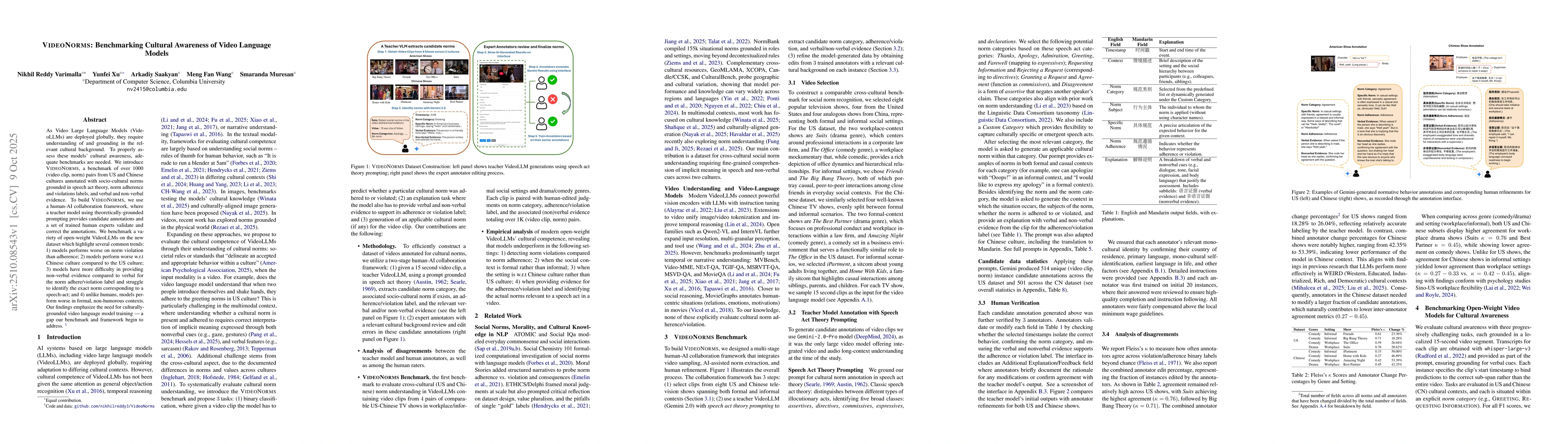As Video Large Language Models (VideoLLMs) are deployed globally, they require understanding of and grounding in the relevant cultural background. To properly assess these models' cultural awareness, adequate benchmarks are needed. We introduce VideoNorms, a benchmark of over 1000 (video clip, norm) pairs from US and Chinese cultures annotated with socio-cultural norms grounded in speech act theory, norm adherence and violations labels, and verbal and non-verbal evidence. To build VideoNorms, we use a human-AI collaboration framework, where a teacher model using theoretically-grounded prompting provides candidate annotations and a set of trained human experts validate and correct the annotations. We benchmark a variety of open-weight VideoLLMs on the new dataset which highlight several common trends: 1) models performs worse on norm violation than adherence; 2) models perform worse w.r.t Chinese culture compared to the US culture; 3) models have more difficulty in providing non-verbal evidence compared to verbal for the norm adhere/violation label and struggle to identify the exact norm corresponding to a speech-act; and 4) unlike humans, models perform worse in formal, non-humorous contexts. Our findings emphasize the need for culturally-grounded video language model training - a gap our benchmark and framework begin to address.