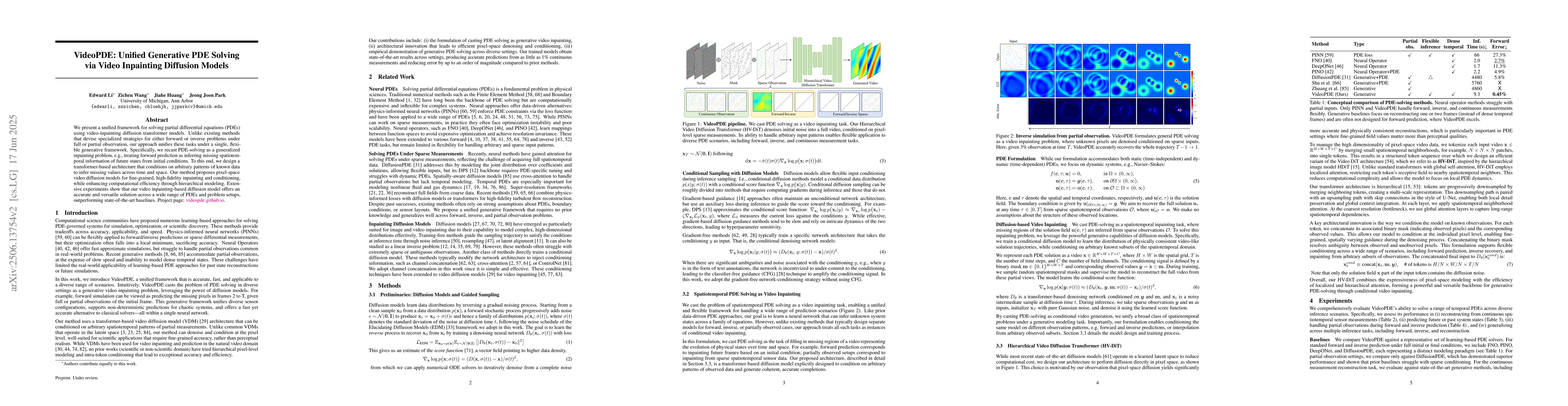 We present a unified framework for solving partial differential equations (PDEs) using video-inpainting diffusion transformer models. Unlike existing methods that devise specialized strategies for either forward or inverse problems under full or partial observation, our approach unifies these tasks under a single, flexible generative framework. Specifically, we recast PDE-solving as a generalized inpainting problem, e.g., treating forward prediction as inferring missing spatiotemporal information of future states from initial conditions. To this end, we design a transformer-based architecture that conditions on arbitrary patterns of known data to infer missing values across time and space. Our method proposes pixel-space video diffusion models for fine-grained, high-fidelity inpainting and conditioning, while enhancing computational efficiency through hierarchical modeling. Extensive experiments show that our video inpainting-based diffusion model offers an accurate and versatile solution across a wide range of PDEs and problem setups, outperforming state-of-the-art baselines.