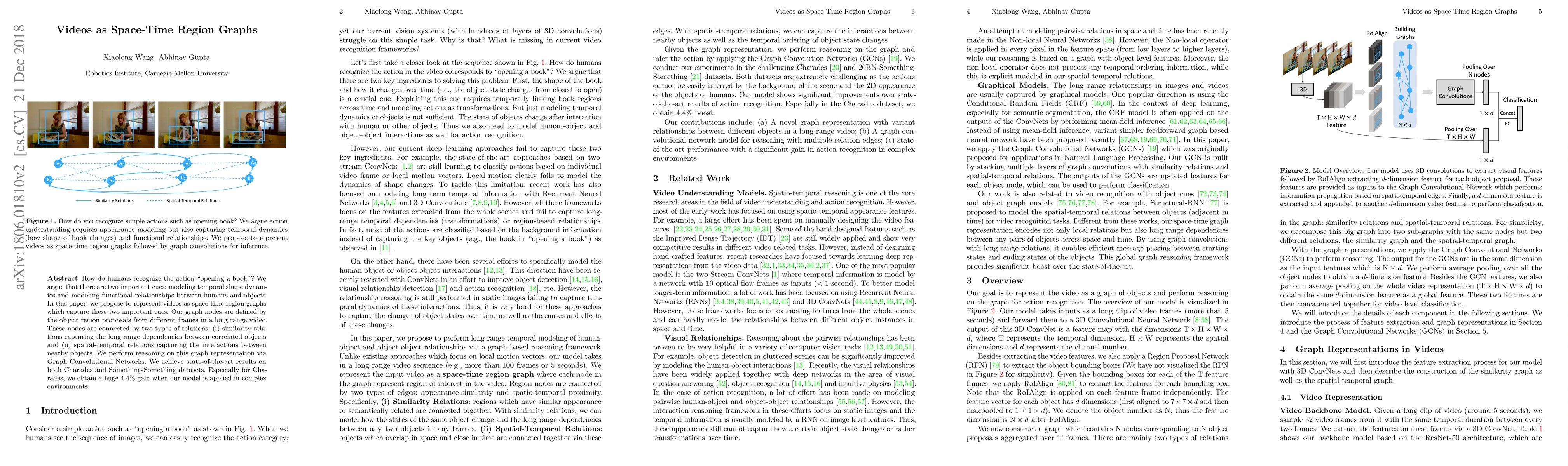 How do humans recognize the action "opening a book" ? We argue that there are two important cues: modeling temporal shape dynamics and modeling functional relationships between humans and objects. In this paper, we propose to represent videos as space-time region graphs which capture these two important cues. Our graph nodes are defined by the object region proposals from different frames in a long range video. These nodes are connected by two types of relations: (i) similarity relations capturing the long range dependencies between correlated objects and (ii) spatial-temporal relations capturing the interactions between nearby objects. We perform reasoning on this graph representation via Graph Convolutional Networks. We achieve state-of-the-art results on both Charades and Something-Something datasets. Especially for Charades, we obtain a huge 4.4% gain when our model is applied in complex environments.