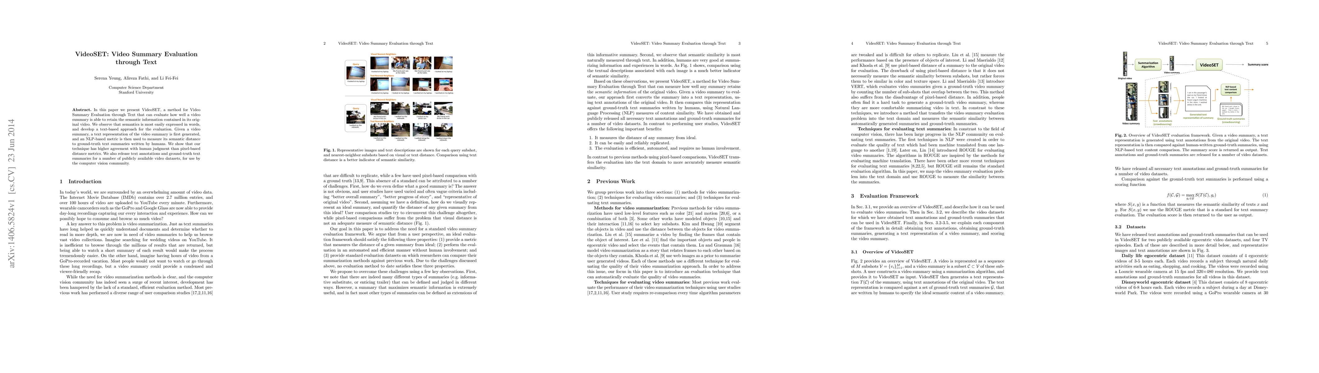 VideoSET evaluates video summaries by comparing their text representations to human-written summaries, using NLP metrics to assess semantic retention. This text-based approach shows higher agreement with human judgments than pixel-based methods and includes released text annotations for public video datasets.