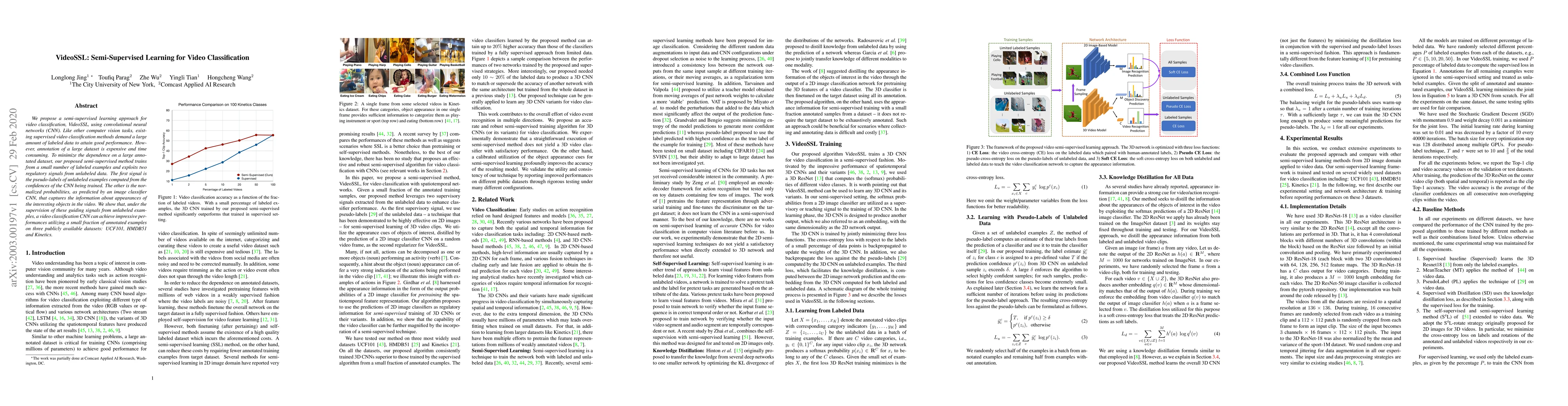 We propose a semi-supervised learning approach for video classification, VideoSSL, using convolutional neural networks (CNN). Like other computer vision tasks, existing supervised video classification methods demand a large amount of labeled data to attain good performance. However, annotation of a large dataset is expensive and time consuming. To minimize the dependence on a large annotated dataset, our proposed semi-supervised method trains from a small number of labeled examples and exploits two regulatory signals from unlabeled data. The first signal is the pseudo-labels of unlabeled examples computed from the confidences of the CNN being trained. The other is the normalized probabilities, as predicted by an image classifier CNN, that captures the information about appearances of the interesting objects in the video. We show that, under the supervision of these guiding signals from unlabeled examples, a video classification CNN can achieve impressive performances utilizing a small fraction of annotated examples on three publicly available datasets: UCF101, HMDB51 and Kinetics.