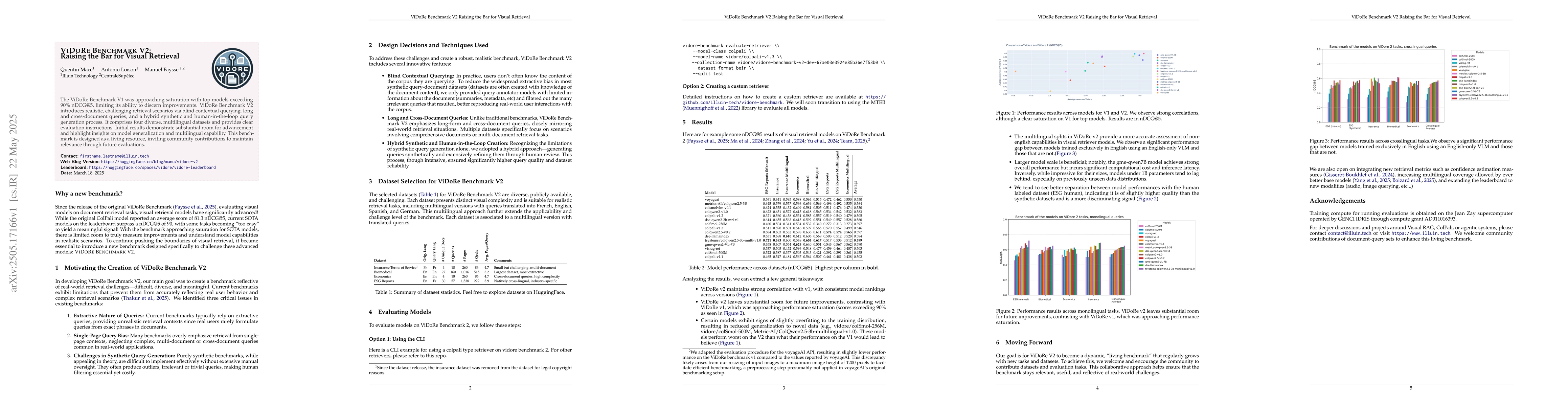 The ViDoRe Benchmark V1 was approaching saturation with top models exceeding 90% nDCG@5, limiting its ability to discern improvements. ViDoRe Benchmark V2 introduces realistic, challenging retrieval scenarios via blind contextual querying, long and cross-document queries, and a hybrid synthetic and human-in-the-loop query generation process. It comprises four diverse, multilingual datasets and provides clear evaluation instructions. Initial results demonstrate substantial room for advancement and highlight insights on model generalization and multilingual capability. This benchmark is designed as a living resource, inviting community contributions to maintain relevance through future evaluations.
