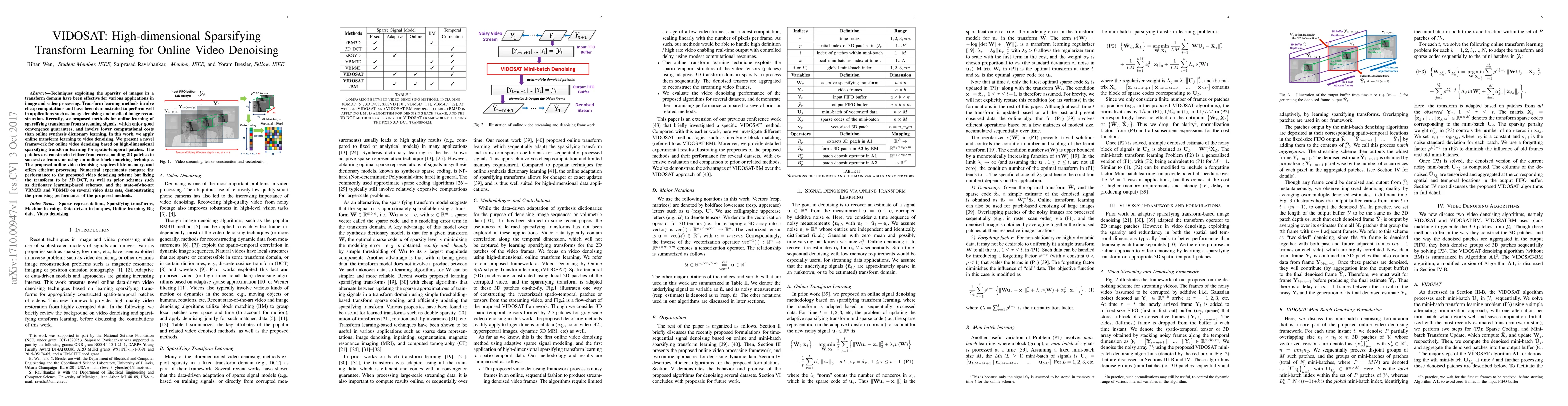 This paper introduces VIDOSAT, a novel framework for online video denoising using high-dimensional sparsifying transform learning for spatio-temporal patches. The method efficiently processes video data with minimal memory requirements and outperforms existing dictionary learning-based and state-of-the-art methods like VBM3D and VBM4D in numerical experiments.