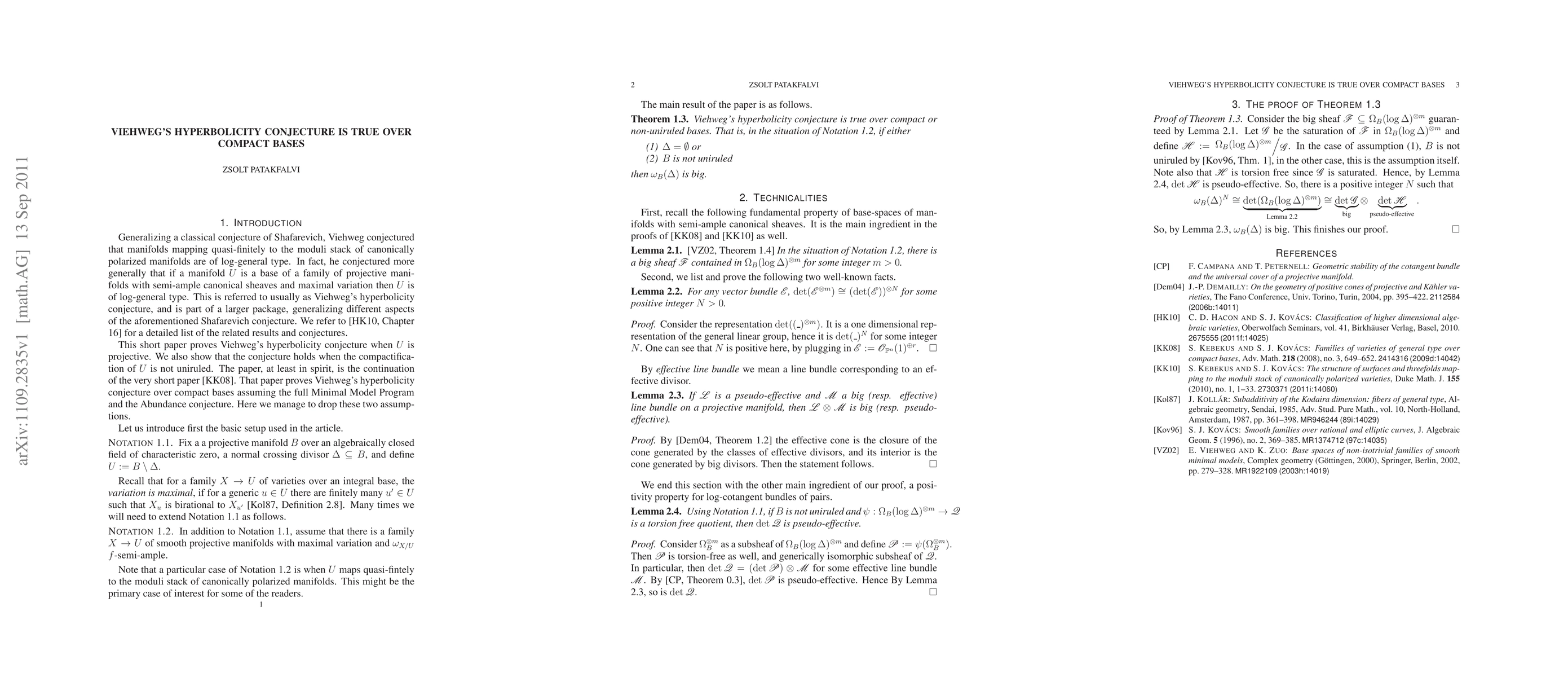 Summary: This paper proves Viehweg's hyperbolicity conjecture, confirming that the base space of a maximal variation family of smooth projective manifolds with a semi-ample canonical sheaf is of log-general type, even over compact bases and non-uniruled compactifications.