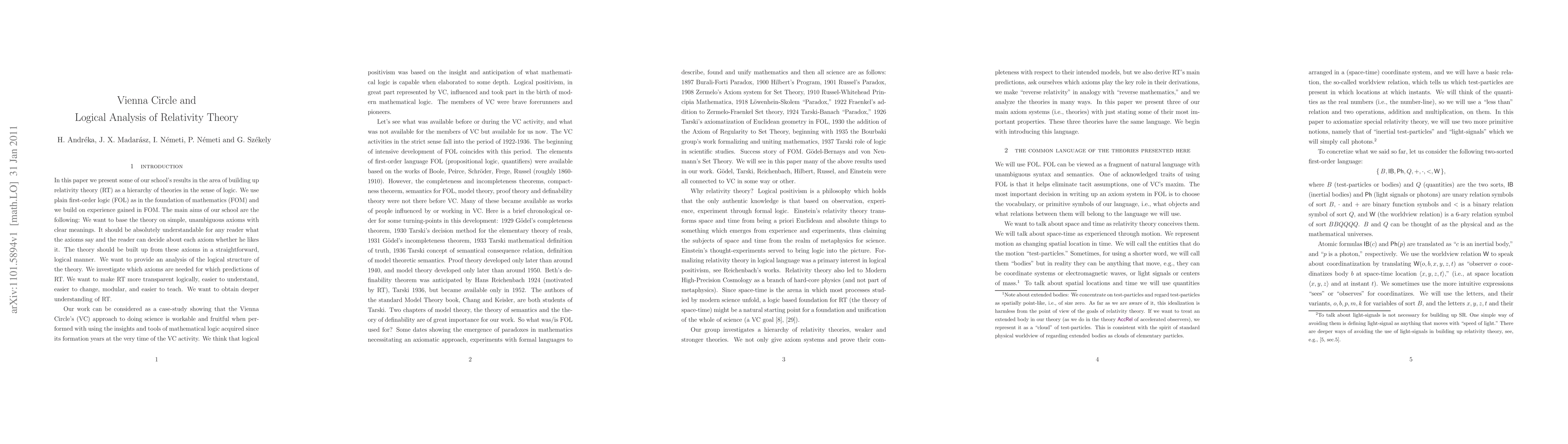 In this paper we present some of our school's results in the area of building up relativity theory (RT) as a hierarchy of theories in the sense of logic. We use plain first-order logic (FOL) as in the foundation of mathematics (FOM) and we build on experience gained in FOM. The main aims of our school are the following: We want to base the theory on simple, unambiguous axioms with clear meanings. It should be absolutely understandable for any reader what the axioms say and the reader can decide about each axiom whether he likes it. The theory should be built up from these axioms in a straightforward, logical manner. We want to provide an analysis of the logical structure of the theory. We investigate which axioms are needed for which predictions of RT. We want to make RT more transparent logically, easier to understand, easier to change, modular, and easier to teach. We want to obtain deeper understanding of RT. Our work can be considered as a case-study showing that the Vienna Circle's (VC) approach to doing science is workable and fruitful when performed with using the insights and tools of mathematical logic acquired since its formation years at the very time of the VC activity. We think that logical positivism was based on the insight and anticipation of what mathematical logic is capable when elaborated to some depth. Logical positivism, in great part represented by VC, influenced and took part in the birth of modern mathematical logic. The members of VC were brave forerunners and pioneers.