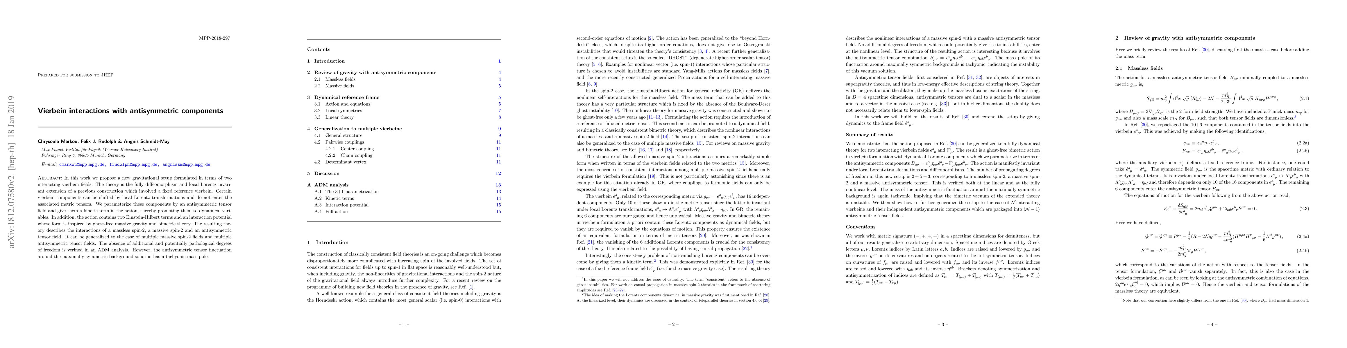 In this work we propose a new gravitational setup formulated in terms of two interacting vierbein fields. The theory is the fully diffeomorphism and local Lorentz invariant extension of a previous construction which involved a fixed reference vierbein. Certain vierbein components can be shifted by local Lorentz transformations and do not enter the associated metric tensors. We parameterize these components by an antisymmetric tensor field and give them a kinetic term in the action, thereby promoting them to dynamical variables. In addition, the action contains two Einstein-Hilbert terms and an interaction potential whose form is inspired by ghost-free massive gravity and bimetric theory. The resulting theory describes the interactions of a massless spin-2, a massive spin-2 and an antisymmetric tensor field. It can be generalized to the case of multiple massive spin-2 fields and multiple antisymmetric tensor fields. The absence of additional and potentially pathological degrees of freedom is verified in an ADM analysis. However, the antisymmetric tensor fluctuation around the maximally symmetric background solution has a tachyonic mass pole.