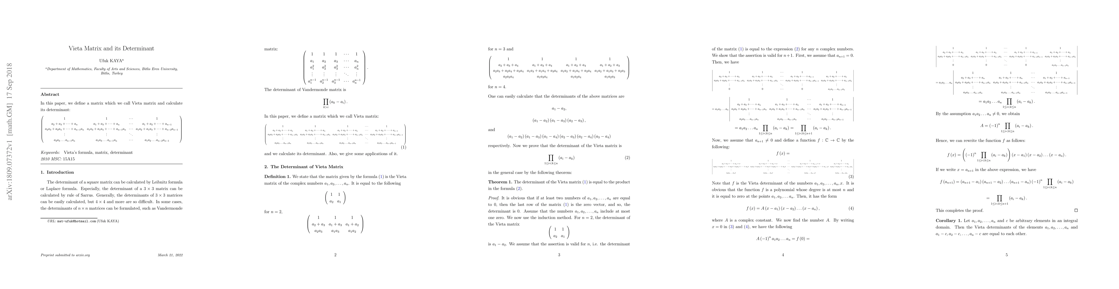 In this paper, we define a matrix which we call Vieta matrix and calculate its determinant: $$ \left( \begin{array}{cccc} 1&1&\cdots&1\\ a_{2}+a_{3}+\cdots+a_{n}&a_{1}+a_{3}+\cdots+a_{n}&\cdots&a_{1}+a_{2}+\cdots+a_{n-1}\\ a_{2}a_{3}+a_{2}a_{4}+\cdots+a_{n-1}a_{n}&a_{1}a_{3}+a_{1}a_{4}+\cdots+a_{n-1}a_{n}&\cdots&a_{1}a_{2}+a_{1}a_{3}+\cdots+a_{n-2}a_{n-1}\\ \vdots&\vdots&\ddots&\vdots\\ a_{2}a_{3}\dots a_{n-1}a_{n}&a_{1}a_{3}\dots a_{n-1}a_{n}&\cdots&a_{1}a_{2}\dots a_{n-2}a_{n-1} \end{array} \right). $$