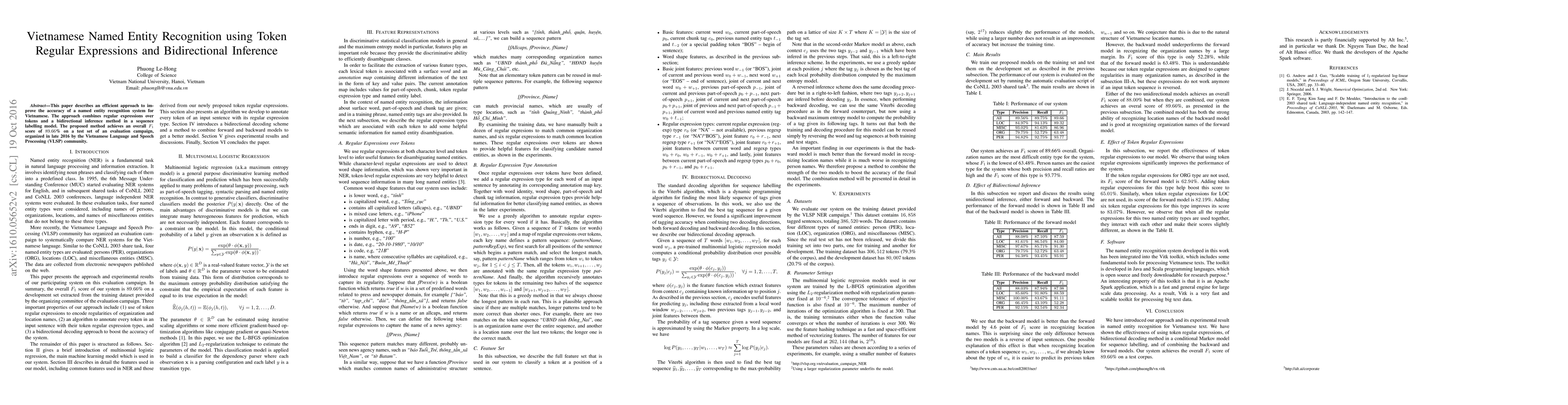 This paper presents a method combining token regular expressions and bidirectional inference for Vietnamese named entity recognition, achieving an $F_1$ score of 89.66% in a VLSP 2016 evaluation campaign. The approach enhances accuracy through a sequence labelling model.