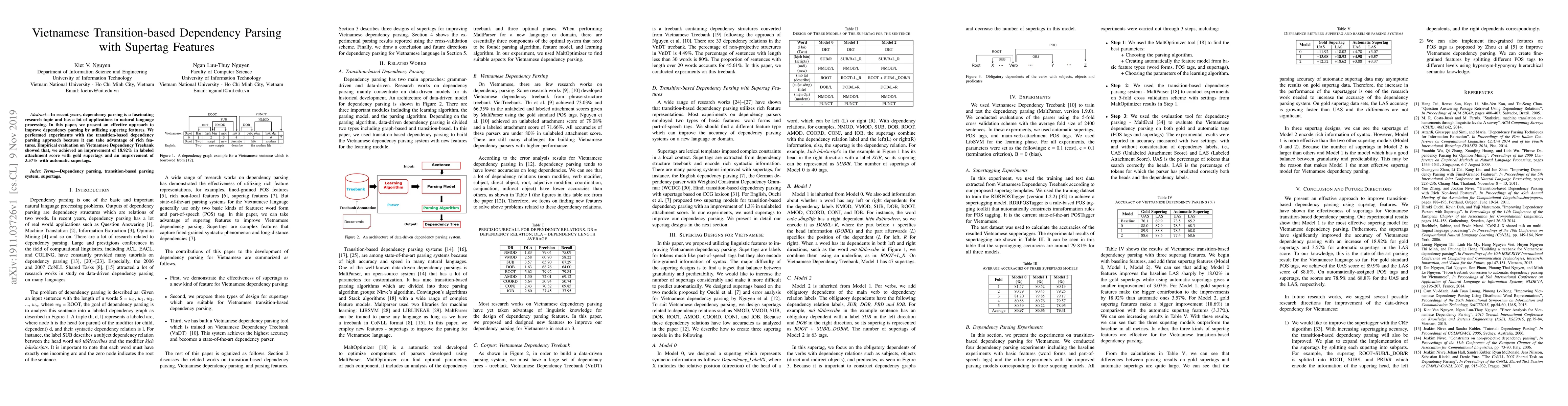 This paper introduces an enhanced transition-based dependency parsing method for Vietnamese using supertag features, achieving a 18.92% improvement with gold supertags and a 3.57% improvement with automatic supertags on the Vietnamese Dependency Treebank.