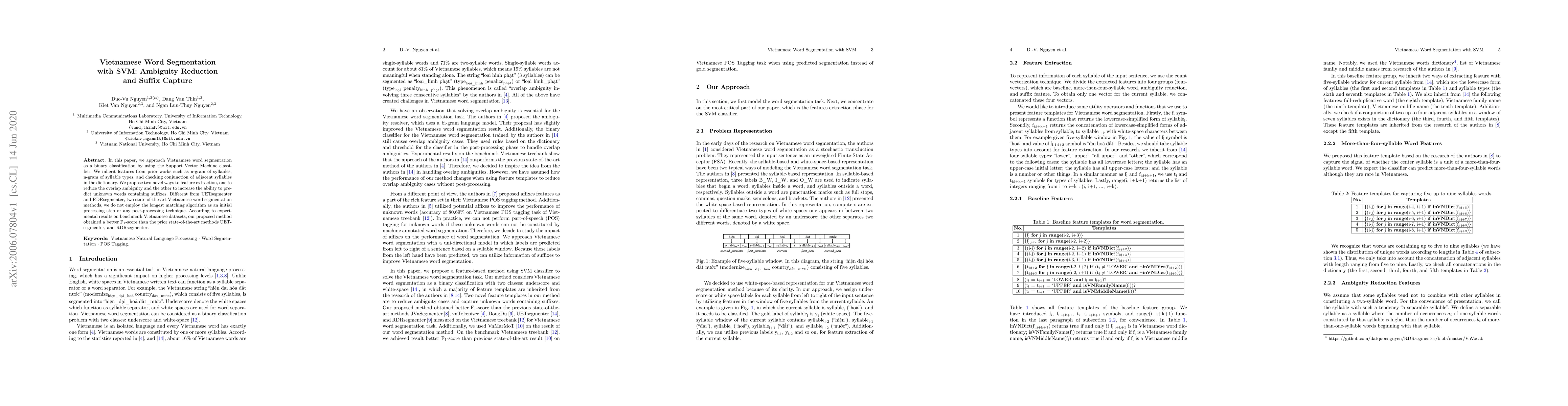 This paper uses an SVM classifier for Vietnamese word segmentation, employing n-gram features and dictionary checks. It introduces novel feature extraction methods to reduce ambiguity and capture suffixes, achieving a higher F1-score than existing state-of-the-art methods without using longest matching or post-processing.