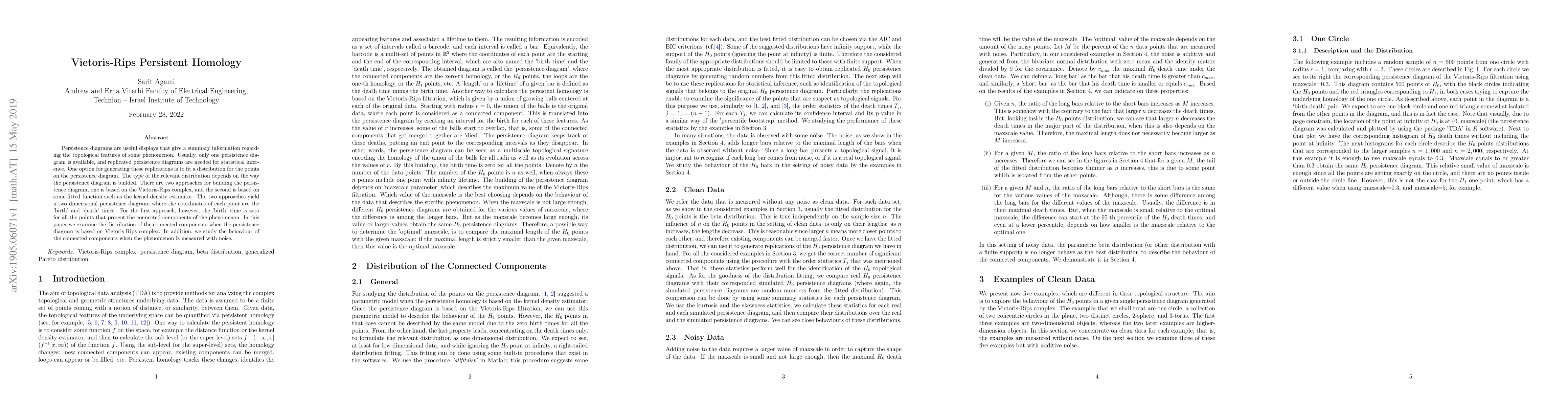 Persistence diagrams are useful displays that give a summary information regarding the topological features of some phenomenon. Usually, only one persistence diagram is available, and replicated persistence diagrams are needed for statistical inference. One option for generating these replications is to fit a distribution for the points on the persistence diagram. The type of the relevant distribution depends on the way the persistence diagram is builded. There are two approaches for building the persistence diagram, one is based on the Vietoris-Rips complex, and the second is based on some fitted function such as the kernel density estimator. The two approaches yield a two dimensional persistence diagram, where the coordinates of each point are the 'birth' and 'death' times. For the first approach, however, the 'birth' time is zero for all the points that present the connected components of the phenomenon. In this paper we examine the distribution of the connected components when the persistence diagram is based on Vietoris-Rips complex. In addition, we study the behaviour of the connected components when the phenomenon is measured with noise.
