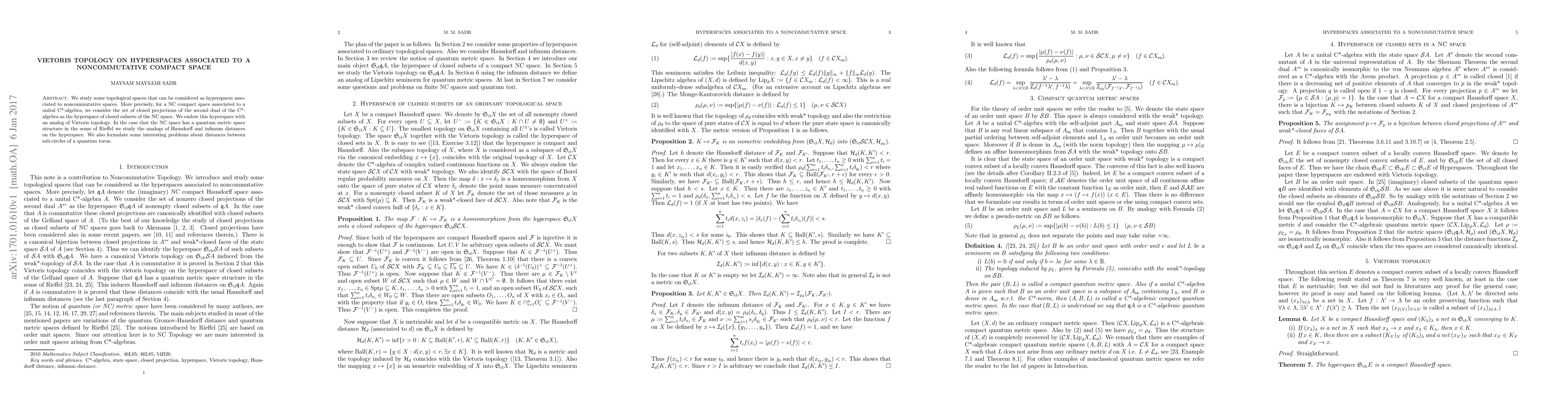 This paper explores the Vietoris topology on hyperspaces linked to noncommutative compact spaces, specifically focusing on the set of closed projections in the second dual of a unital C*-algebra. It introduces analogs of Hausdorff and infimum distances for these hyperspaces when the noncommutative space has a quantum metric structure.