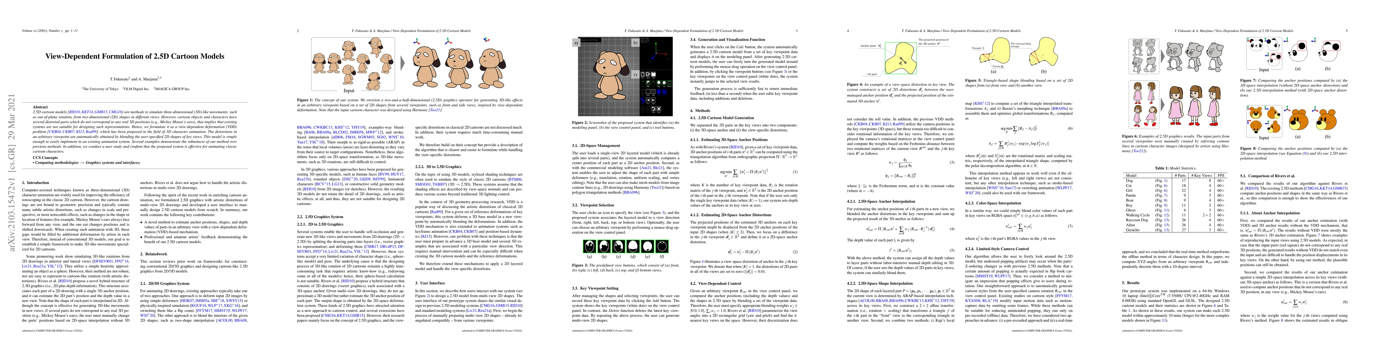 This paper presents a view-dependent deformation method for 2.5D cartoon models, enabling realistic 3D-like movements from 2D shapes by blending key view shapes. The proposed system effectively handles distortions in cartoon characters and is validated through user studies.